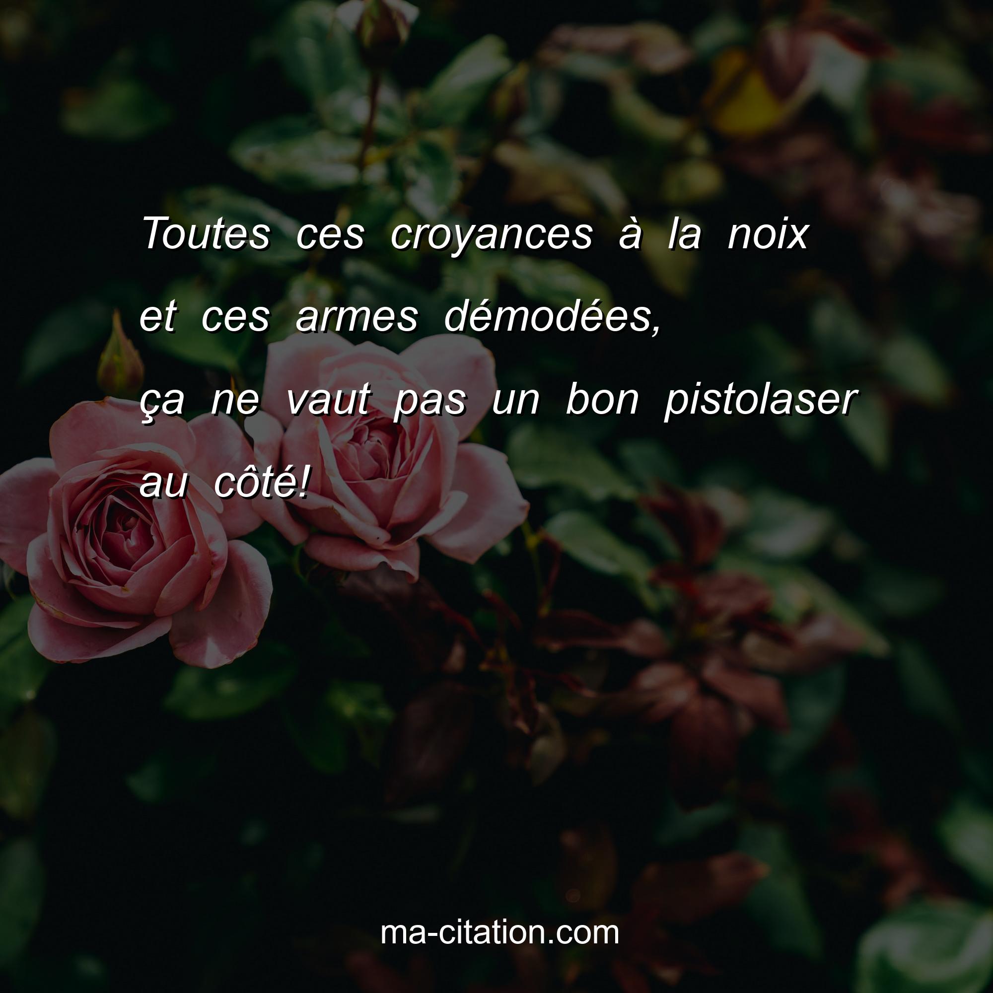 Citation sur la vie :Toutes ces croyances à la noix et ces armes démodées, ça ne vaut pas un bon pistolaser au côté!