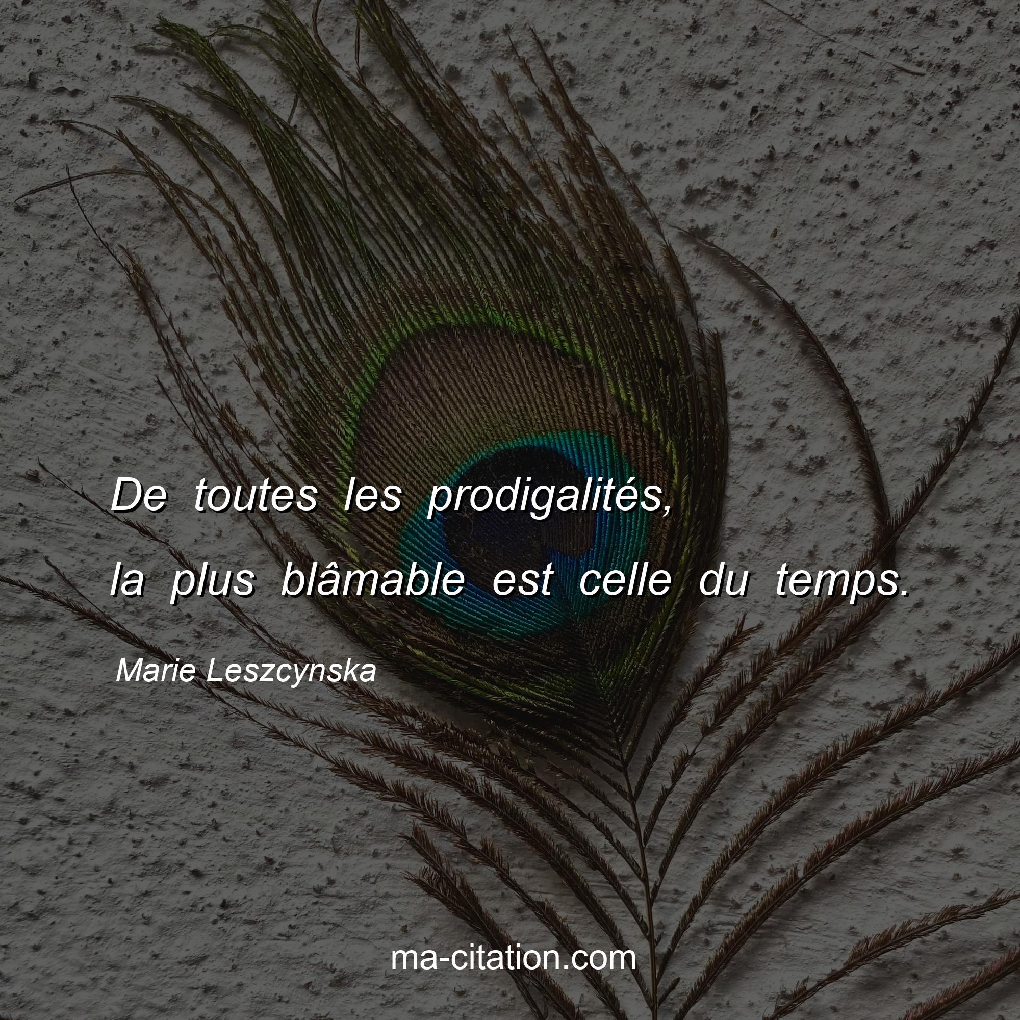 Marie Leszcynska est l'auteur de la citation sur la vie "De toutes les prodigalités, la plus blâmable est celle du temps.".
