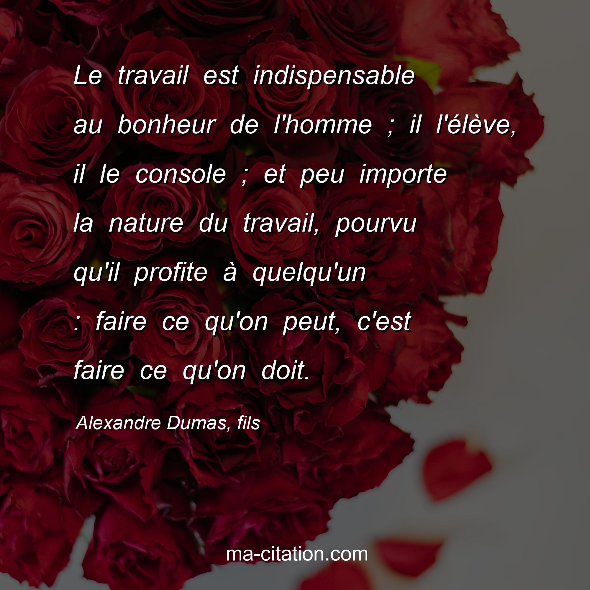 Citation sur la vie d'Alexandre Dumas, fils :Le travail est indispensable au bonheur de l'homme ; il l'élève, il le console ; et peu importe la nature du travail, pourvu qu'il profite à quelqu'un : faire ce qu'on peut, c'est faire ce qu'on doit.
