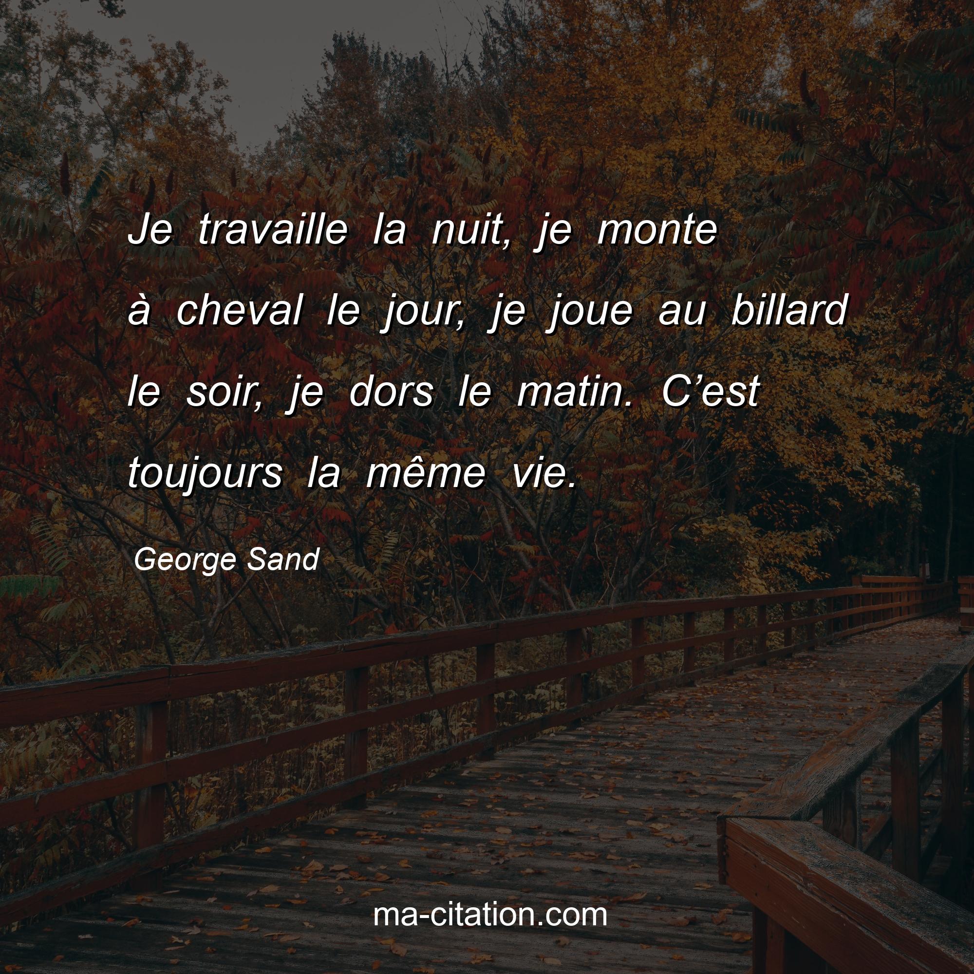 George Sand est l'auteur de la citation sur la vie "Je travaille la nuit, je monte à cheval le jour, je joue au billard le soir, je dors le matin. C’est toujours la même vie.".