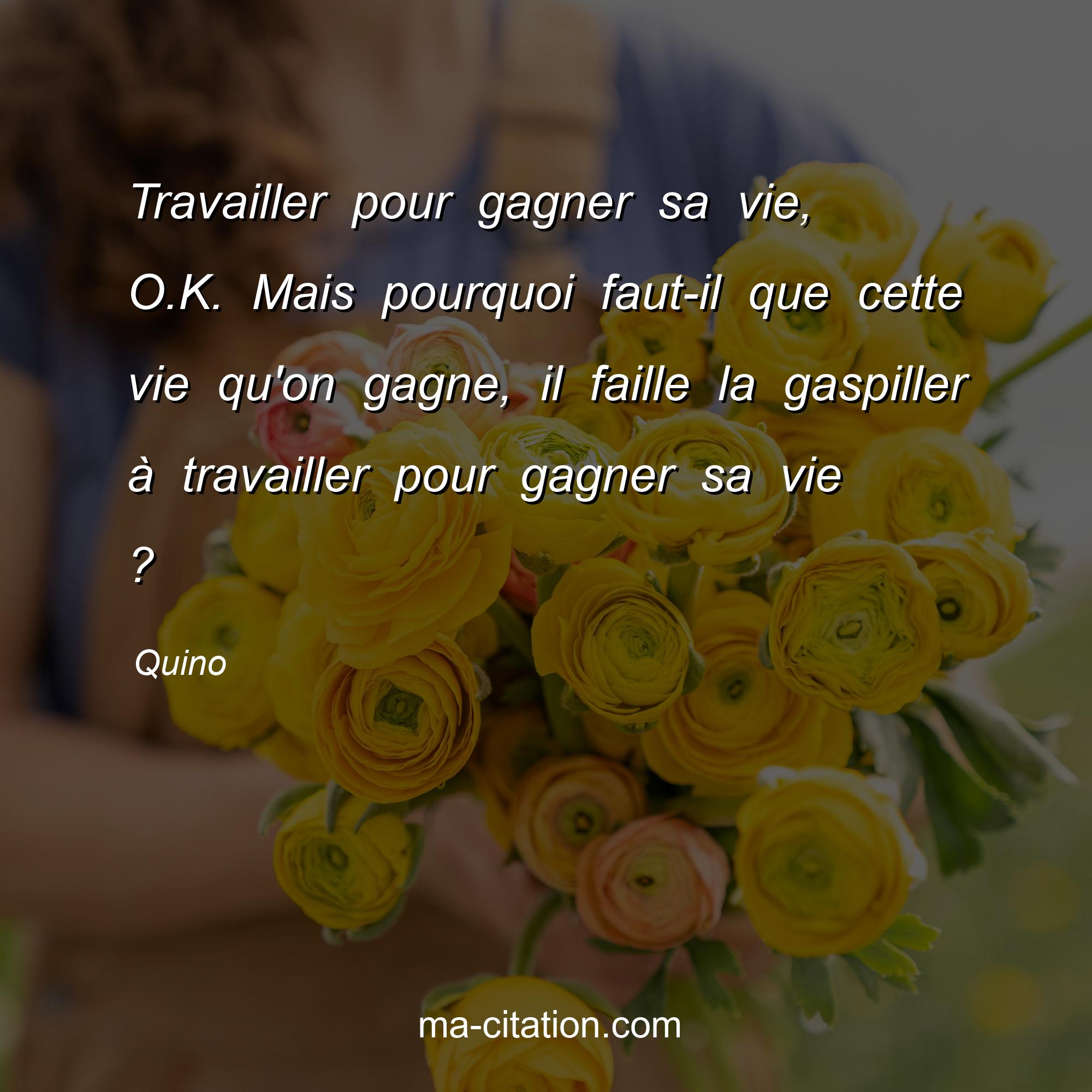 Citation sur la vie de Quino :Travailler pour gagner sa vie, O.K. Mais pourquoi faut-il que cette vie qu'on gagne, il faille la gaspiller à travailler pour gagner sa vie ?