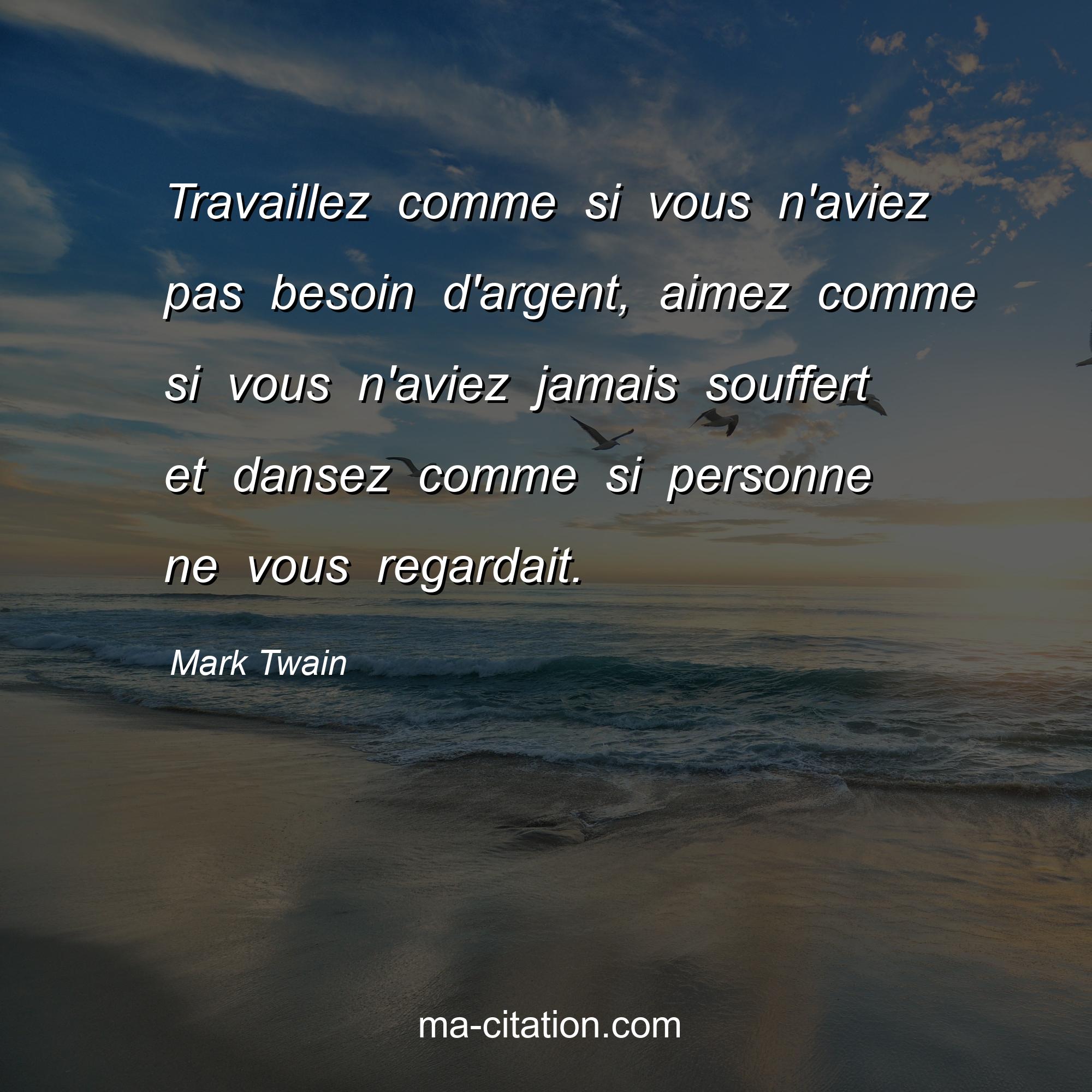 Citation sur la vie de Mark Twain :Travaillez comme si vous n'aviez pas besoin d'argent, aimez comme si vous n'aviez jamais souffert et dansez comme si personne ne vous regardait.