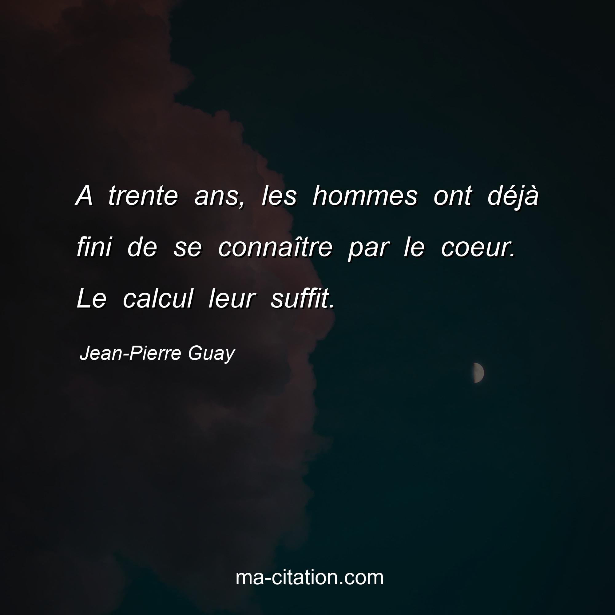 Jean-Pierre Guay est l'auteur de la citation sur la vie "A trente ans, les hommes ont déjà fini de se connaître par le coeur. Le calcul leur suffit.".