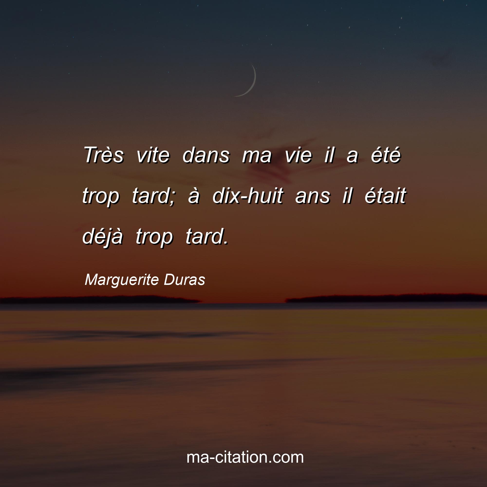 Citation sur la vie de Marguerite Duras :Très vite dans ma vie il a été trop tard; à dix-huit ans il était déjà trop tard.