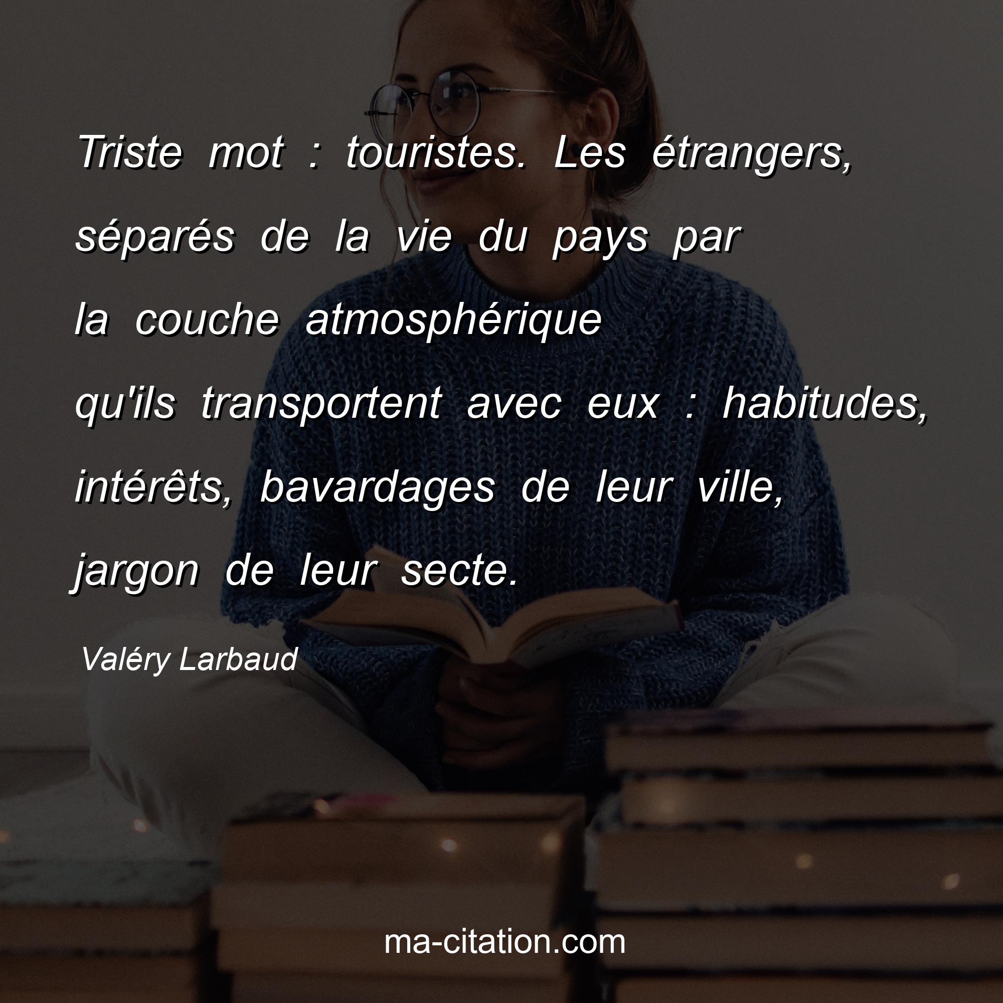 Citation sur la vie de Valéry Larbaud :Triste mot : touristes. Les étrangers, séparés de la vie du pays par la couche atmosphérique qu'ils transportent avec eux : habitudes, intérêts, bavardages de leur ville, jargon de leur secte.