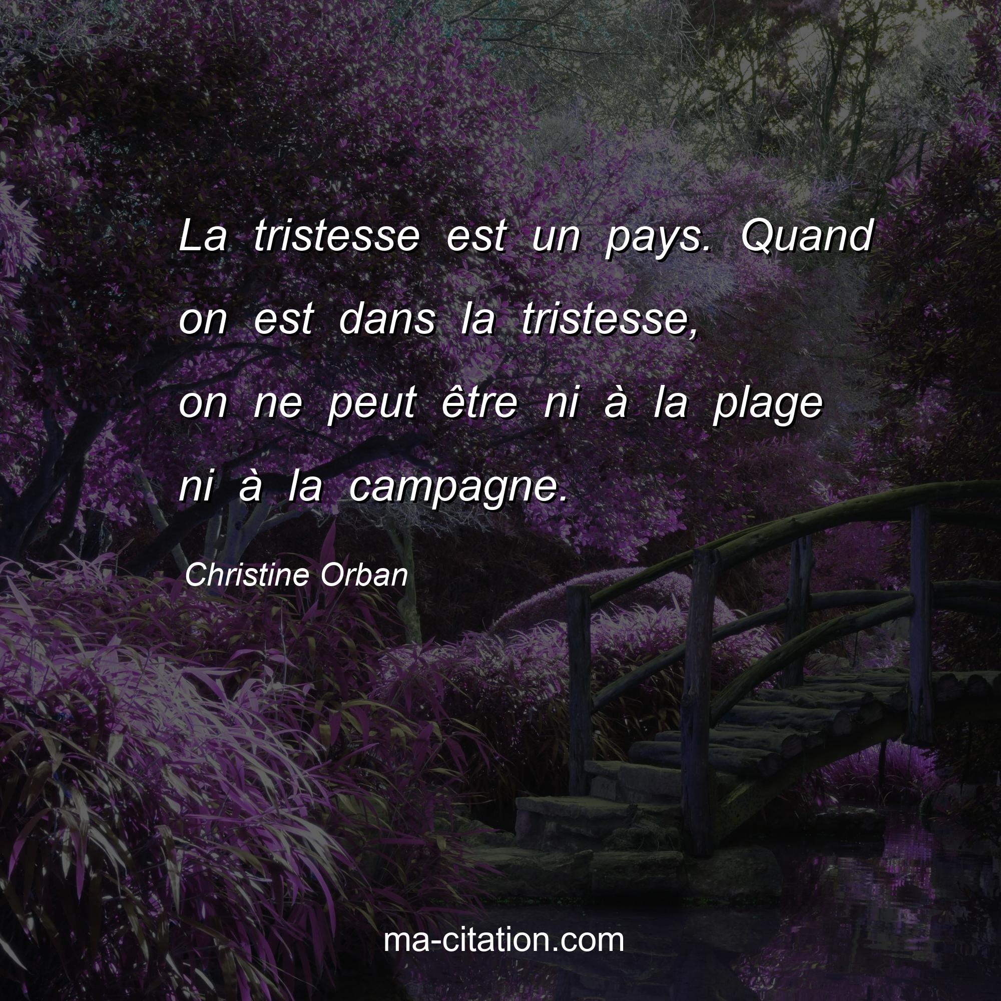 Citation sur la vie de Christine Orban :La tristesse est un pays. Quand on est dans la tristesse, on ne peut être ni à la plage ni à la campagne.
