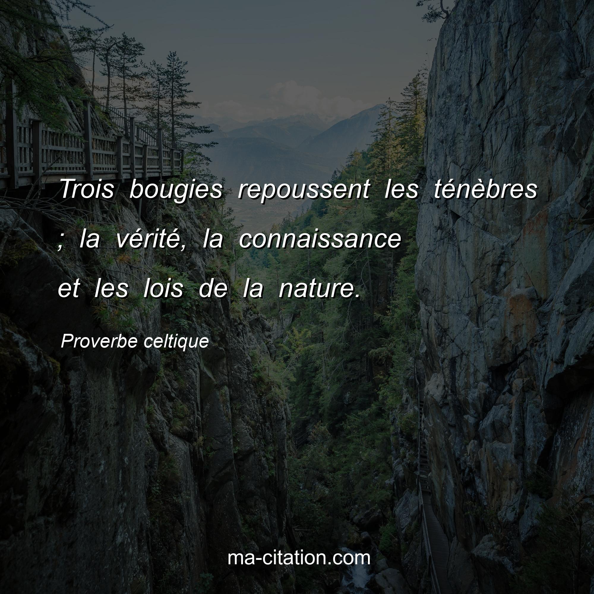 Proverbe celtique sur la vie :Trois bougies repoussent les ténèbres ; la vérité, la connaissance et les lois de la nature.