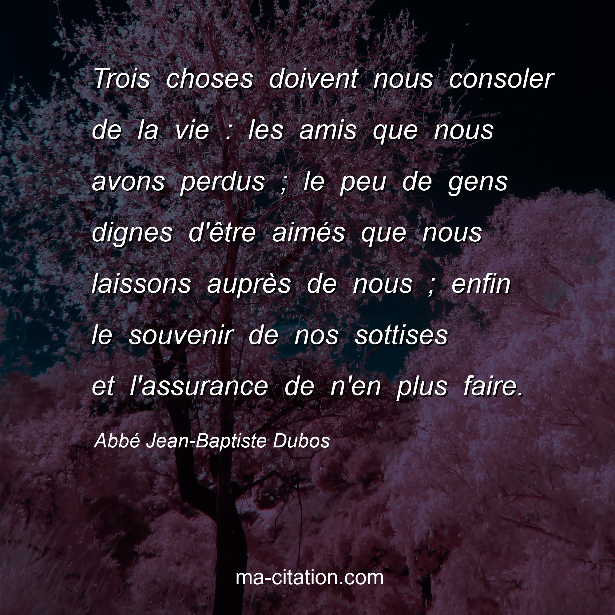 Citation sur la vie d'Abbé Jean-Baptiste Dubos :Trois choses doivent nous consoler de la vie : les amis que nous avons perdus ; le peu de gens dignes d'être aimés que nous laissons auprès de nous ; enfin le souvenir de nos sottises et l'assurance de n'en plus faire.