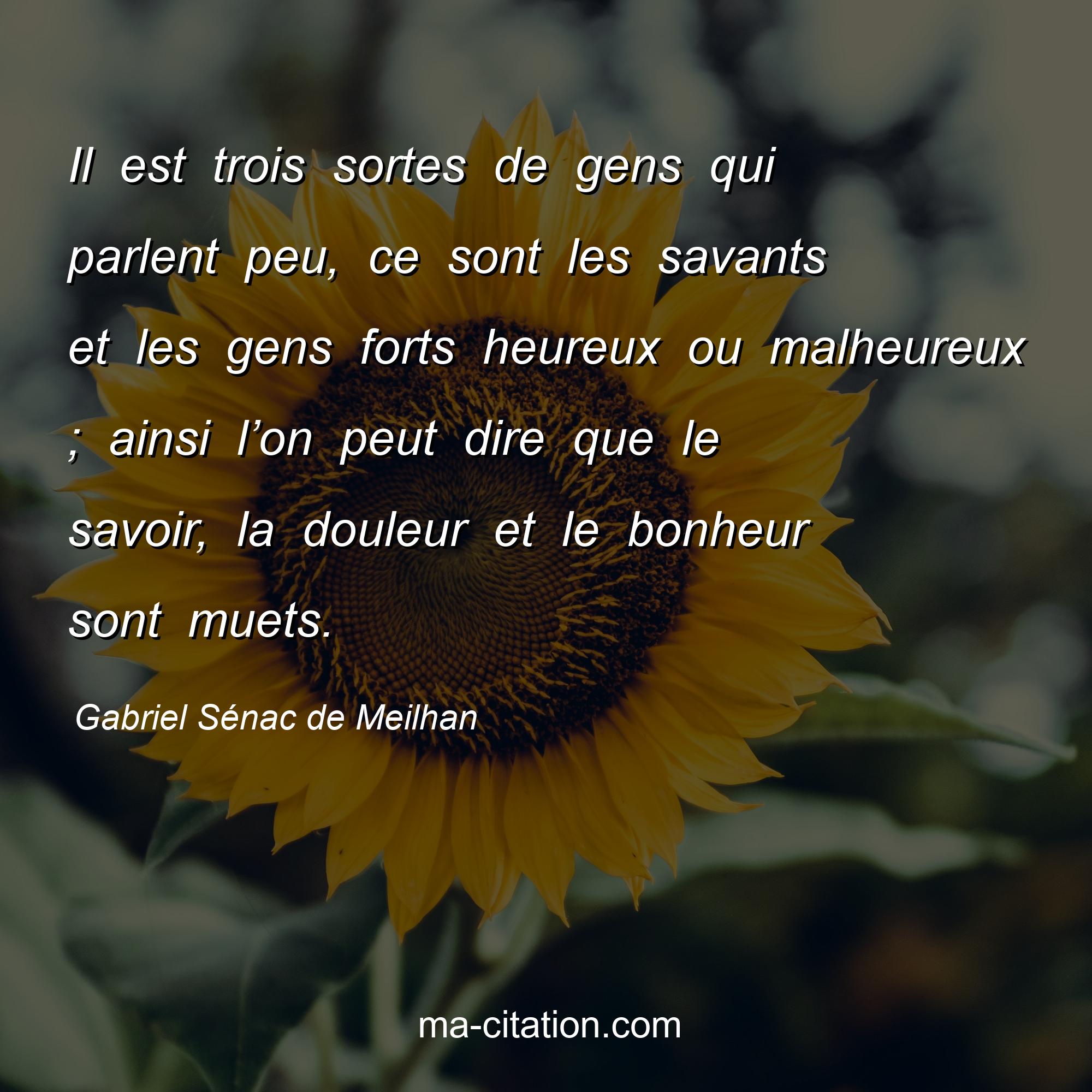 Citation sur la vie de Gabriel Sénac de Meilhan :Il est trois sortes de gens qui parlent peu, ce sont les savants et les gens forts heureux ou malheureux ; ainsi l’on peut dire que le savoir, la douleur et le bonheur sont muets.