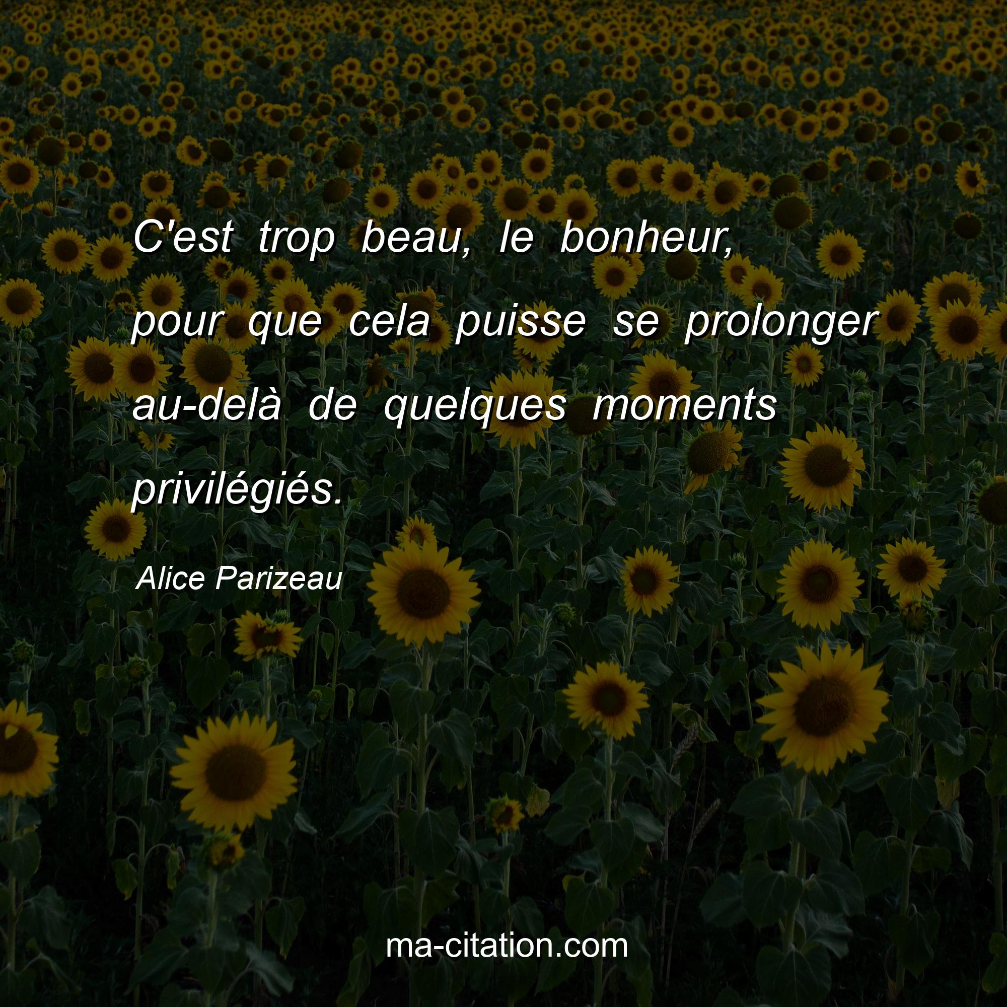 Citation sur la vie d'Alice Parizeau :C'est trop beau, le bonheur, pour que cela puisse se prolonger au-delà de quelques moments privilégiés.