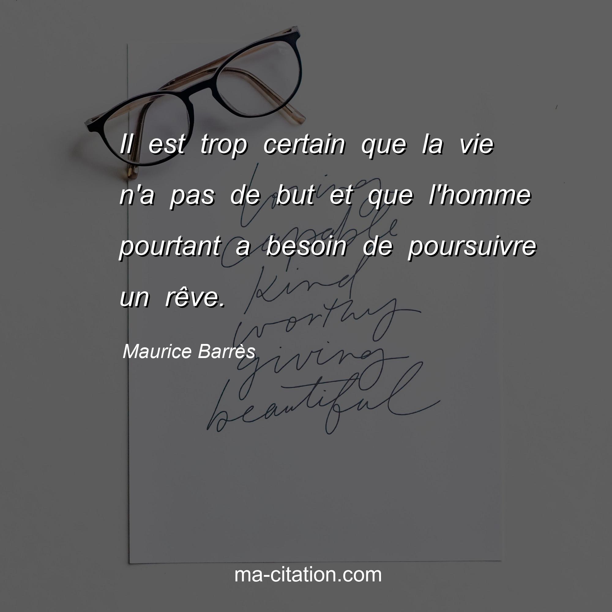 Maurice Barrès est l'auteur de la citation sur la vie "Il est trop certain que la vie n'a pas de but et que l'homme pourtant a besoin de poursuivre un rêve.".