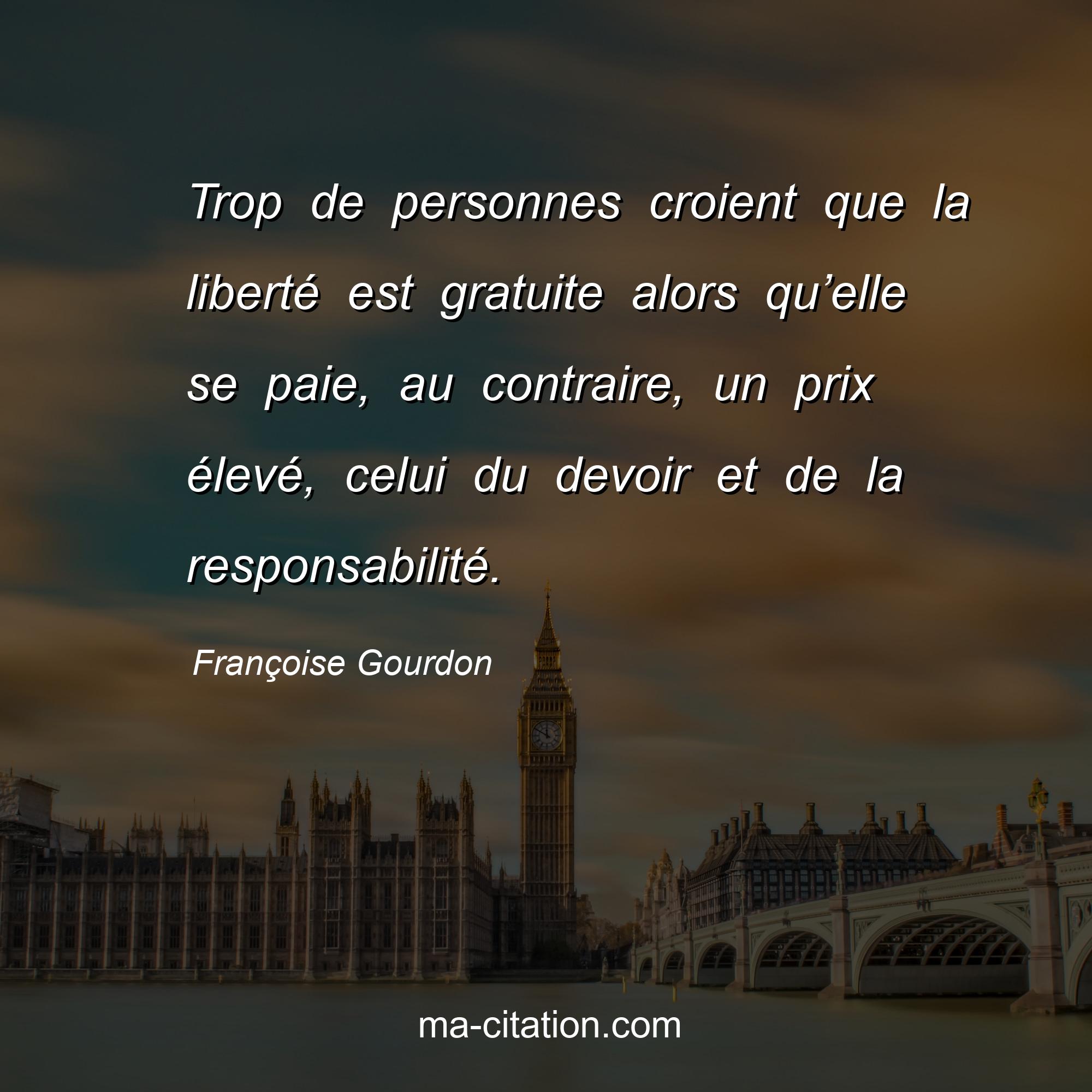 Françoise Gourdon est l'auteur de la citation sur la vie "Trop de personnes croient que la liberté est gratuite alors qu’elle se paie, au contraire, un prix élevé, celui du devoir et de la responsabilité.".