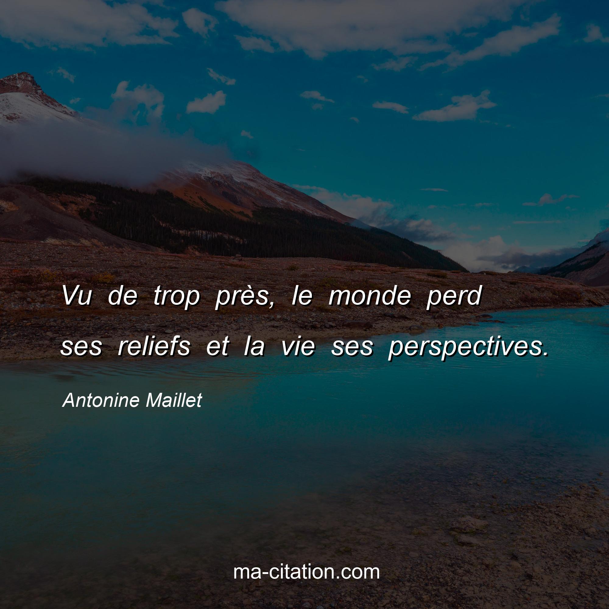 Citation sur la vie d'Antonine Maillet :Vu de trop près, le monde perd ses reliefs et la vie ses perspectives.