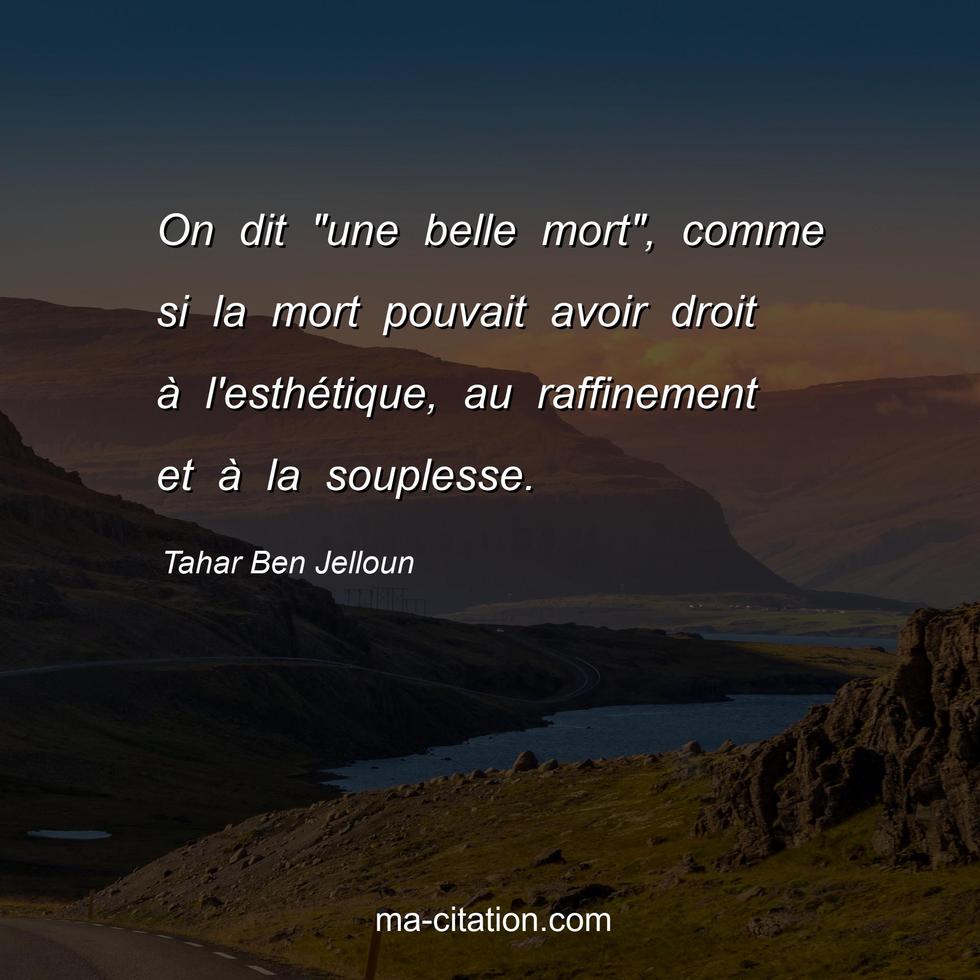 Citation sur la vie de Tahar Ben Jelloun :On dit "une belle mort", comme si la mort pouvait avoir droit à l'esthétique, au raffinement et à la souplesse.