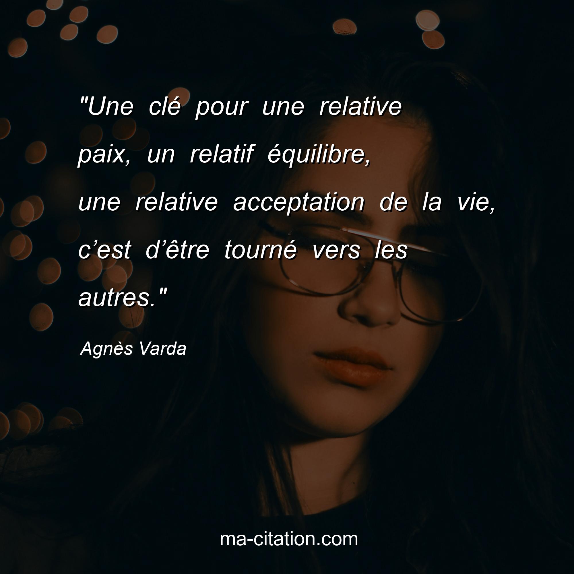 Agnès Varda est l'auteur de la citation sur la vie ""Une clé pour une relative paix, un relatif équilibre, une relative acceptation de la vie, c’est d’être tourné vers les autres."".