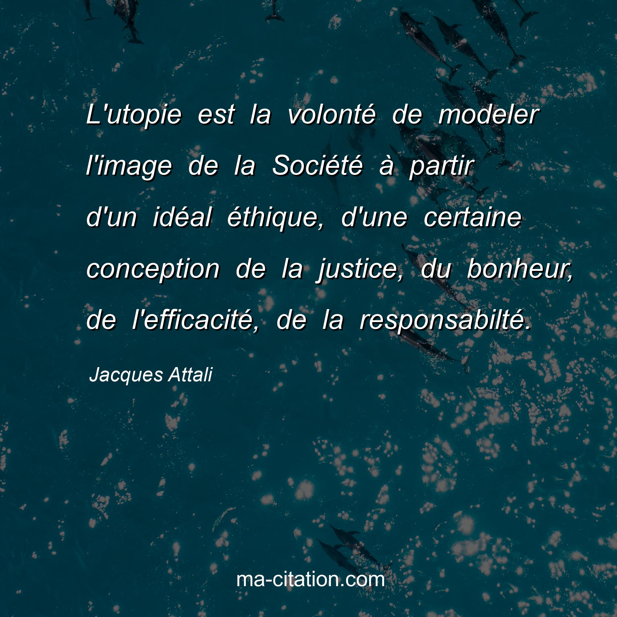 Citation sur la vie de Jacques Attali :L'utopie est la volonté de modeler l'image de la Société à partir d'un idéal éthique, d'une certaine conception de la justice, du bonheur, de l'efficacité, de la responsabilté.