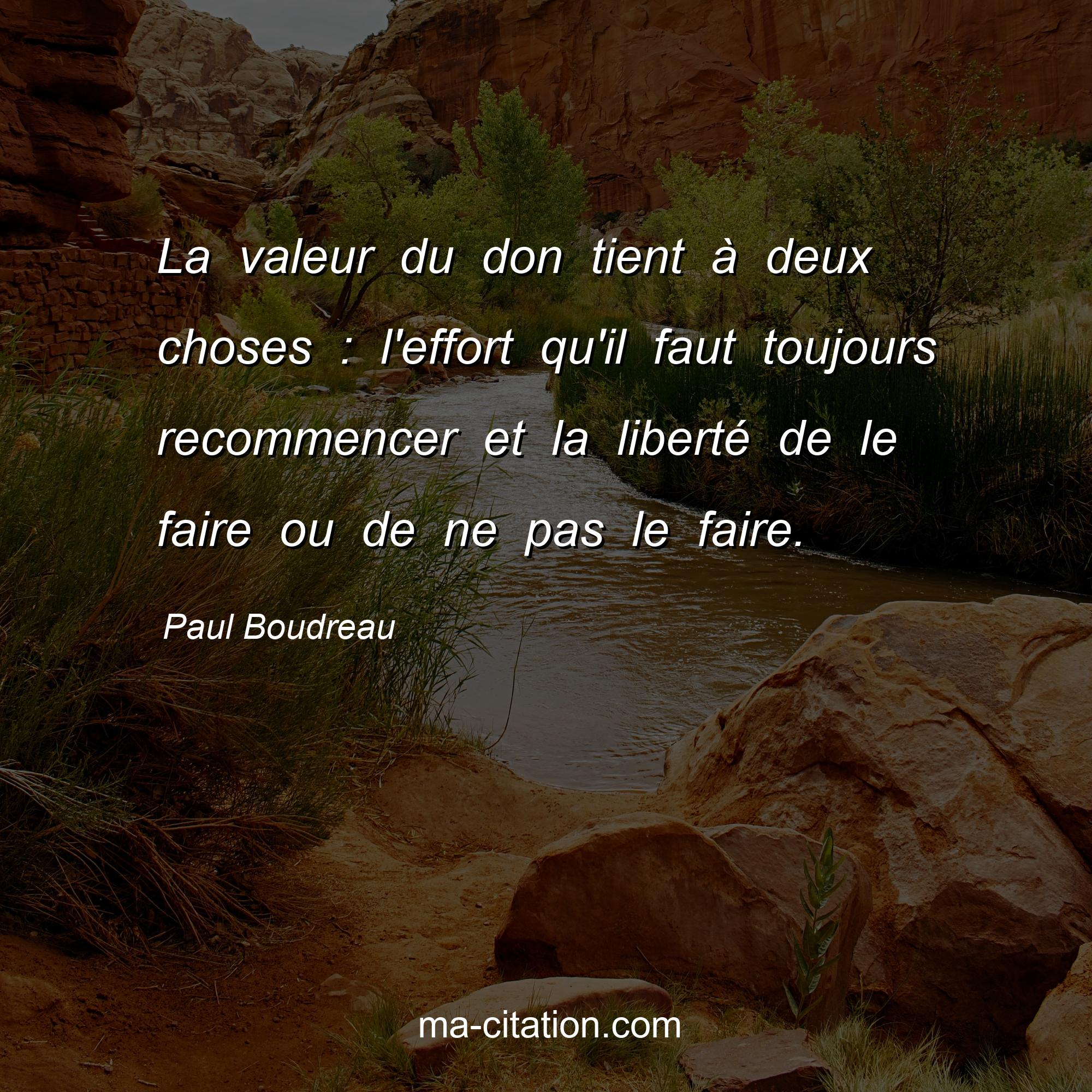 Citation sur la vie de Paul Boudreau :La valeur du don tient à deux choses : l'effort qu'il faut toujours recommencer et la liberté de le faire ou de ne pas le faire.
