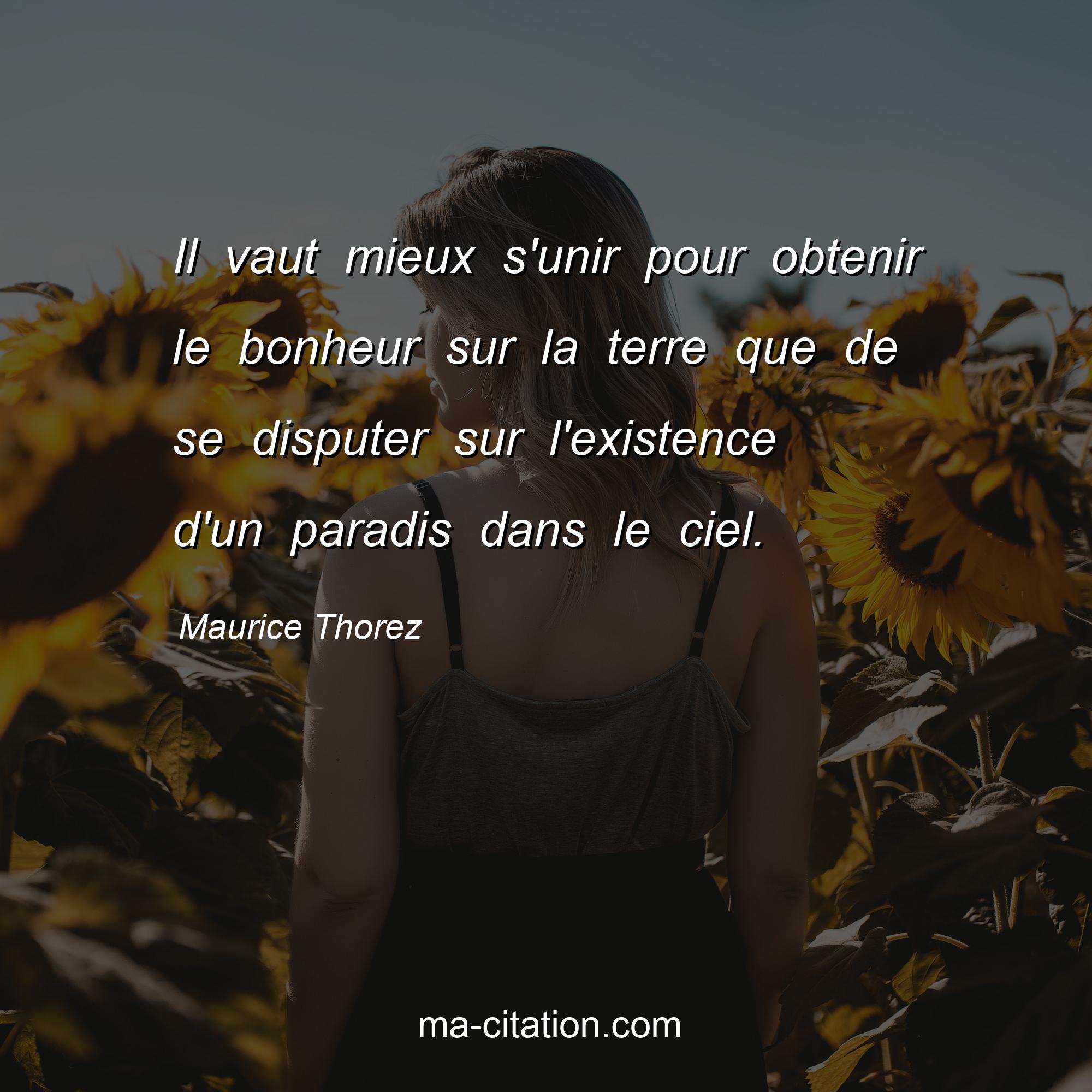 Maurice Thorez est l'auteur de la citation sur la vie "Il vaut mieux s'unir pour obtenir le bonheur sur la terre que de se disputer sur l'existence d'un paradis dans le ciel.".