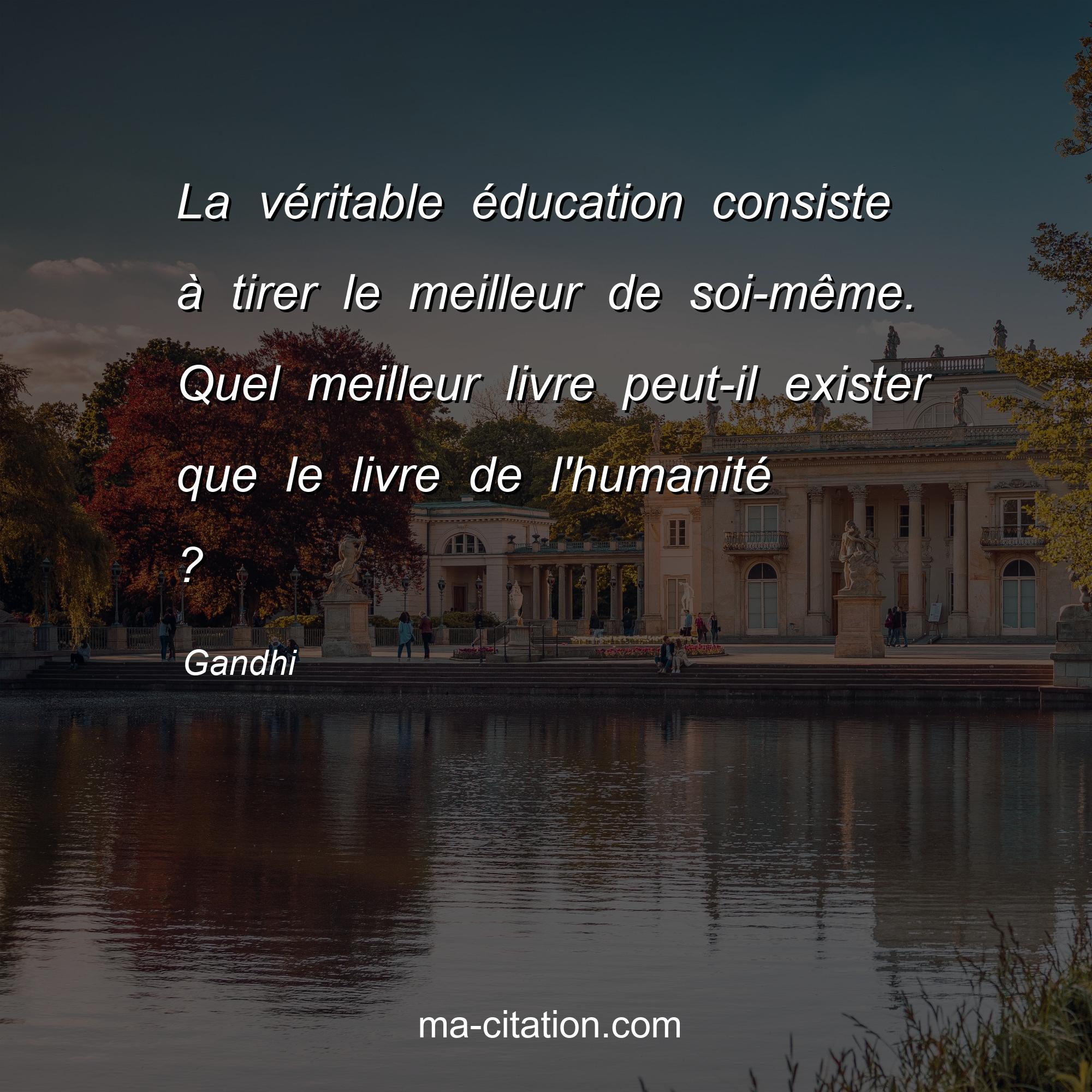 Citation sur la vie de Gandhi :La véritable éducation consiste à tirer le meilleur de soi-même. Quel meilleur livre peut-il exister que le livre de l'humanité ?
