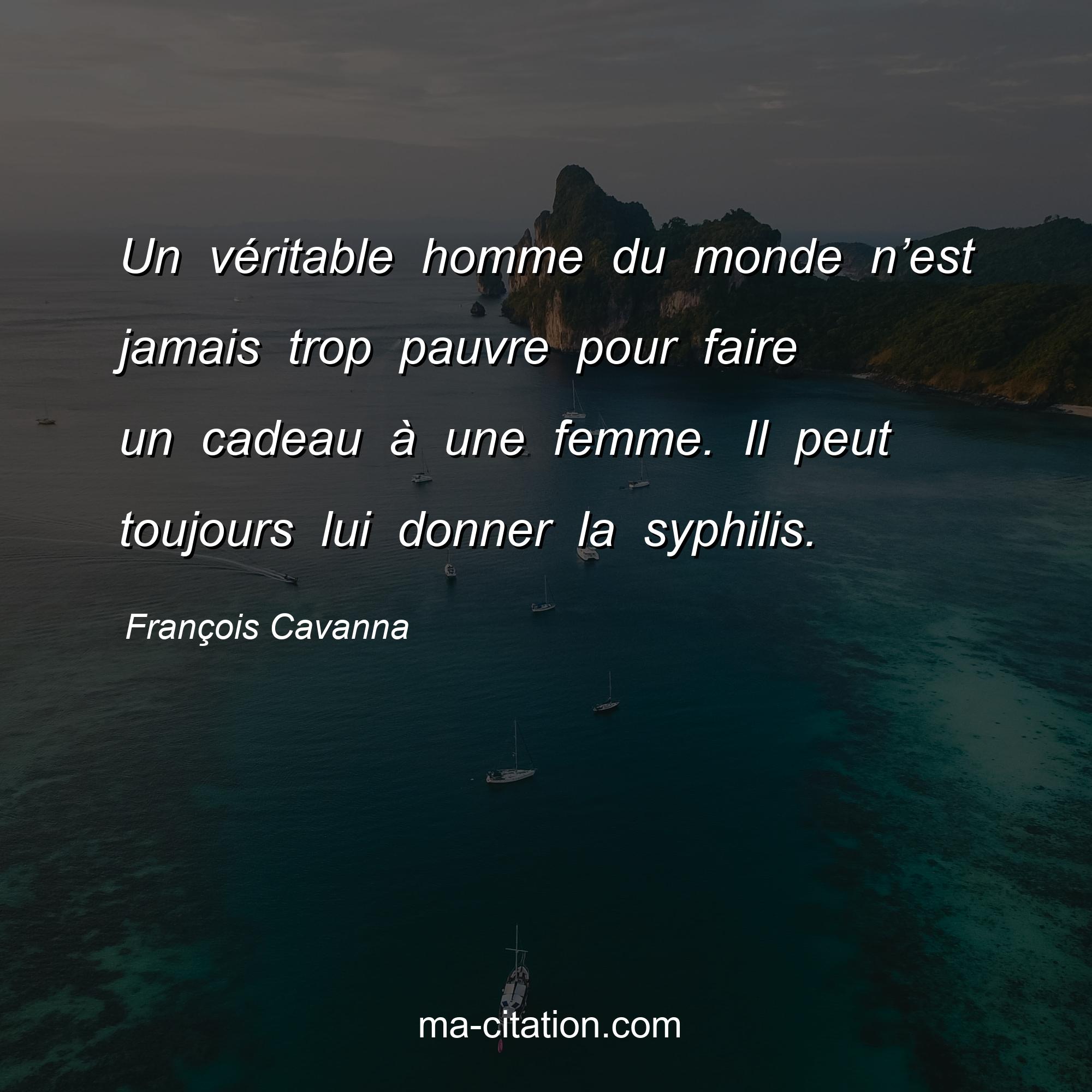Citation sur la vie de François Cavanna :Un véritable homme du monde n’est jamais trop pauvre pour faire un cadeau à une femme. Il peut toujours lui donner la syphilis.