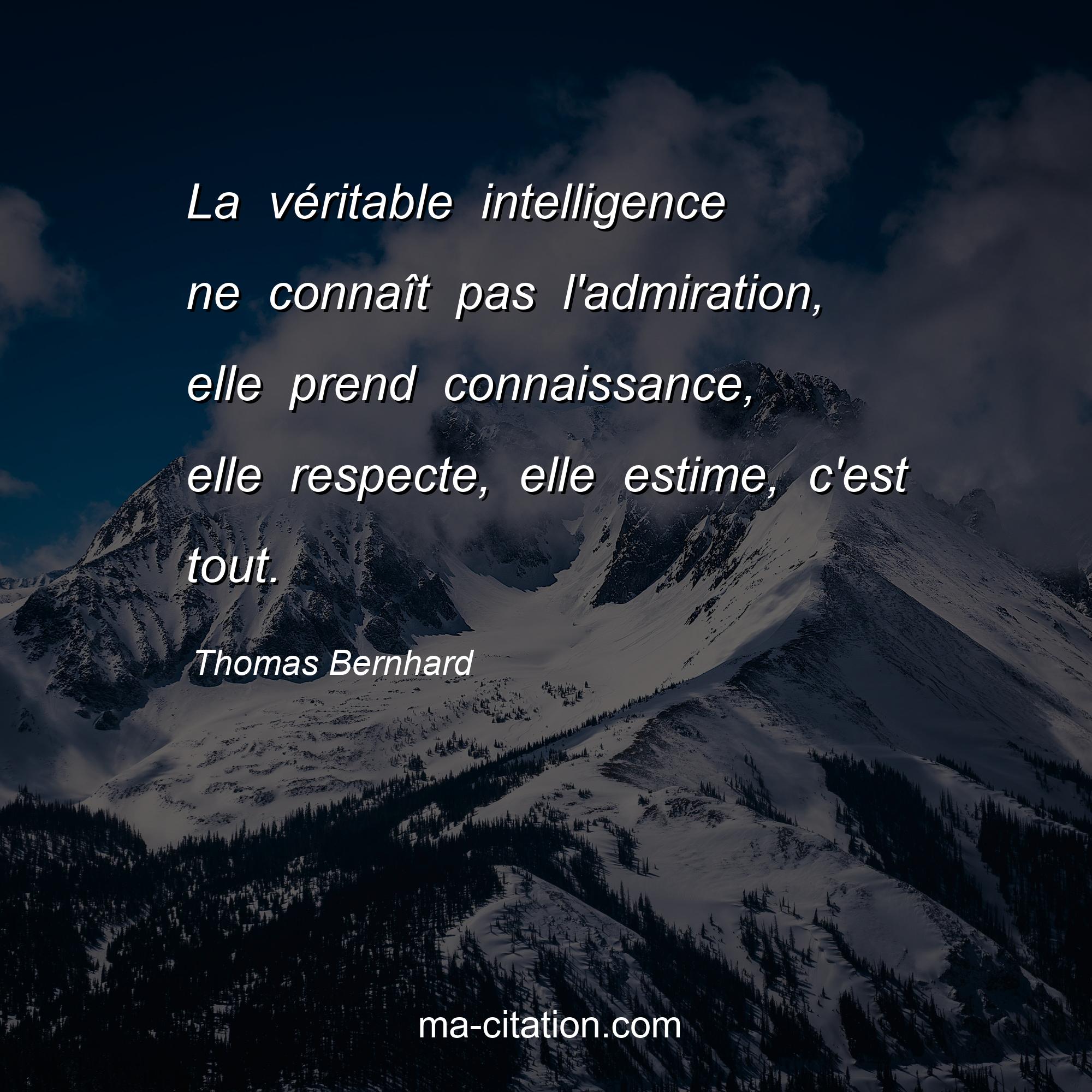 Citation sur la vie de Thomas Bernhard :La véritable intelligence ne connaît pas l'admiration, elle prend connaissance, elle respecte, elle estime, c'est tout.