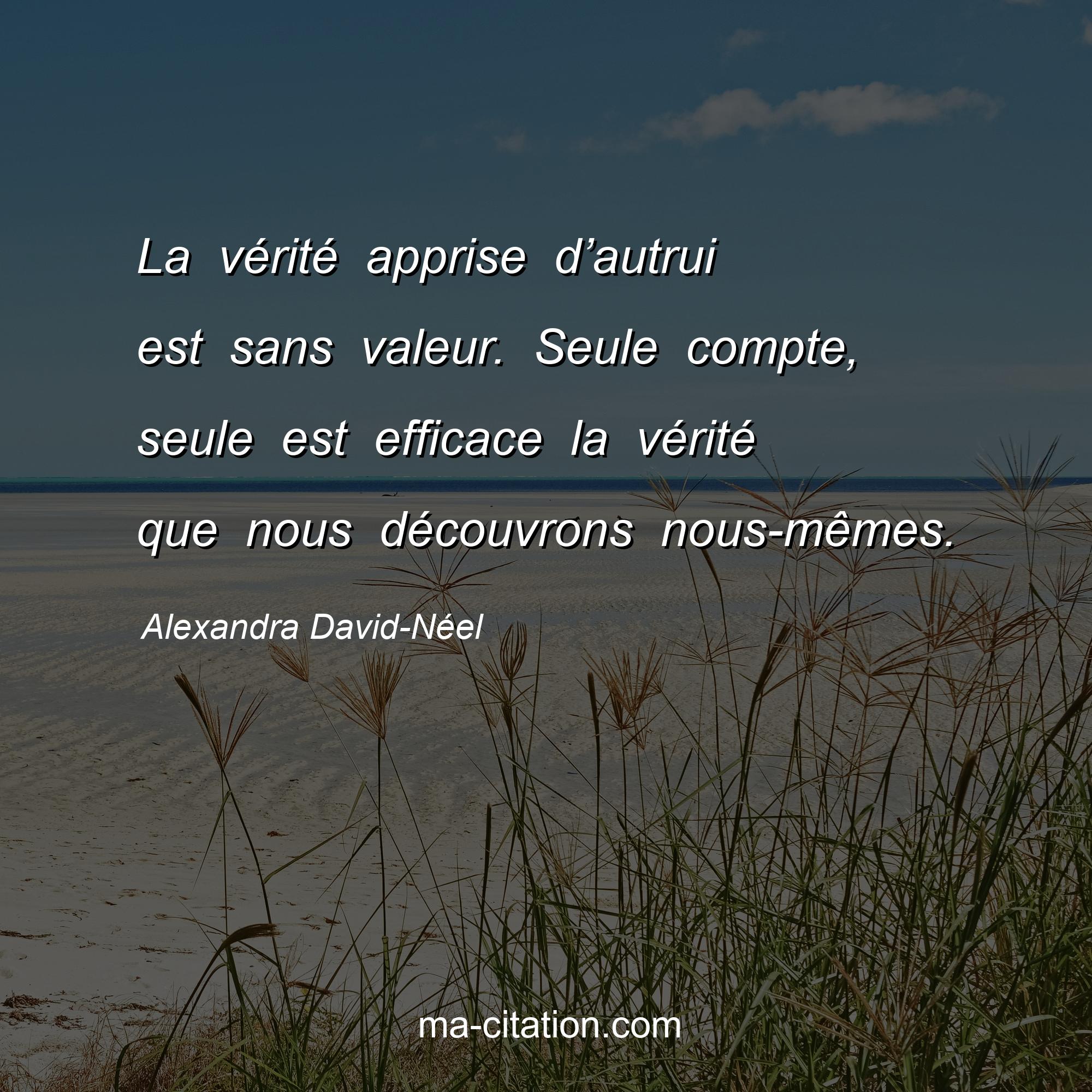 Citation sur la vie d'Alexandra David-Néel :La vérité apprise d’autrui est sans valeur. Seule compte, seule est efficace la vérité que nous découvrons nous-mêmes.