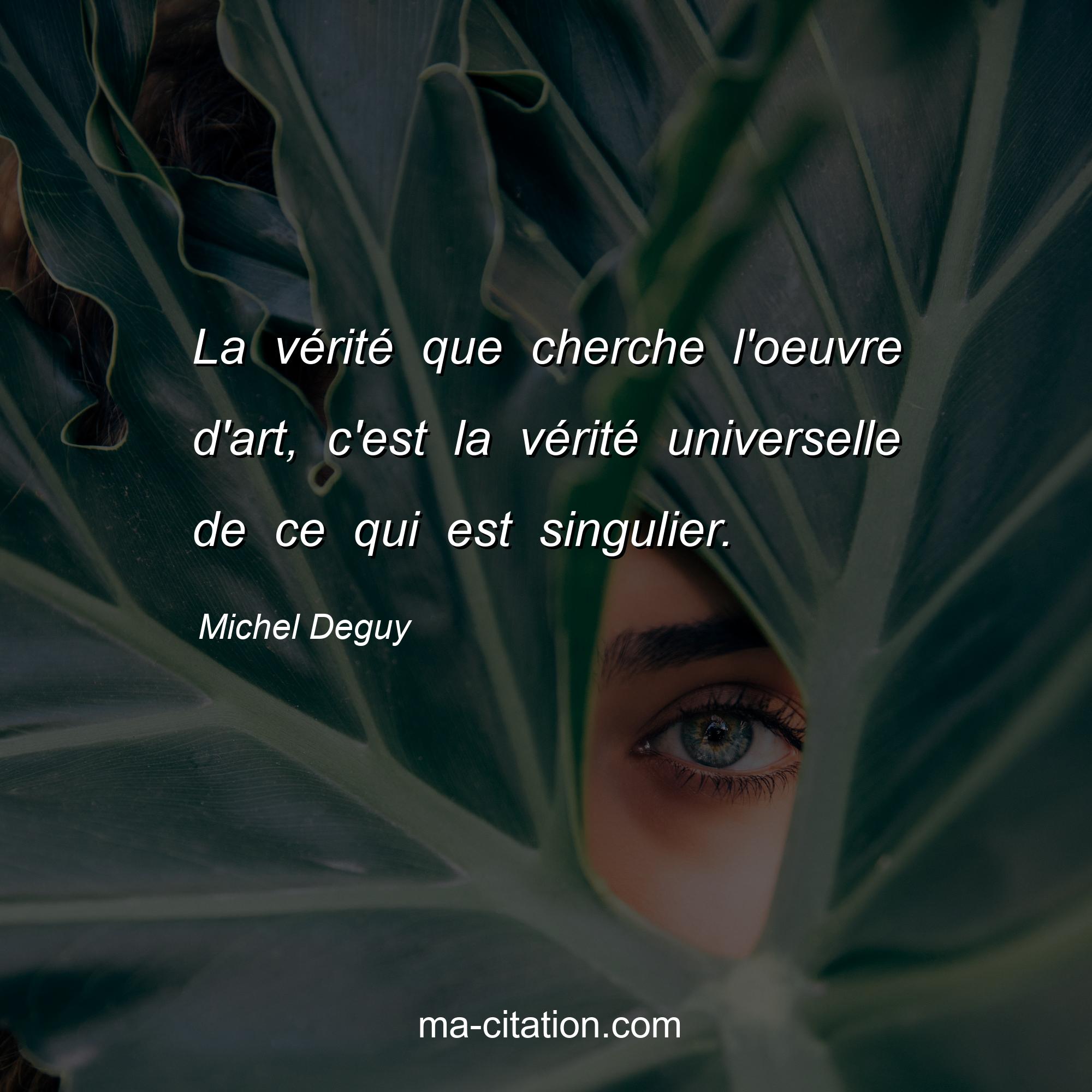 Citation sur la vie de Michel Deguy :La vérité que cherche l'oeuvre d'art, c'est la vérité universelle de ce qui est singulier.