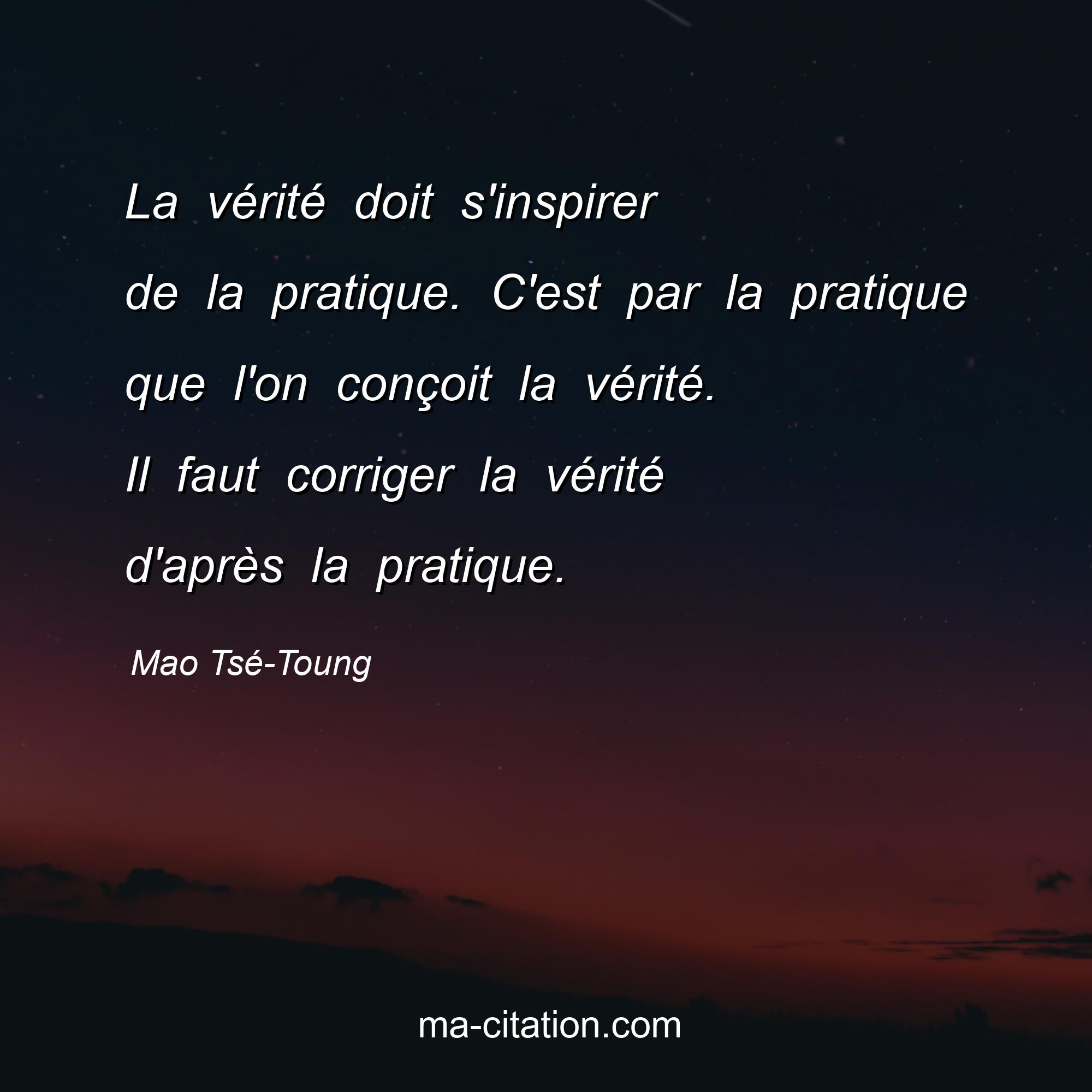 Citation sur la vie de Mao Tsé-Toung :La vérité doit s'inspirer de la pratique. C'est par la pratique que l'on conçoit la vérité. Il faut corriger la vérité d'après la pratique.