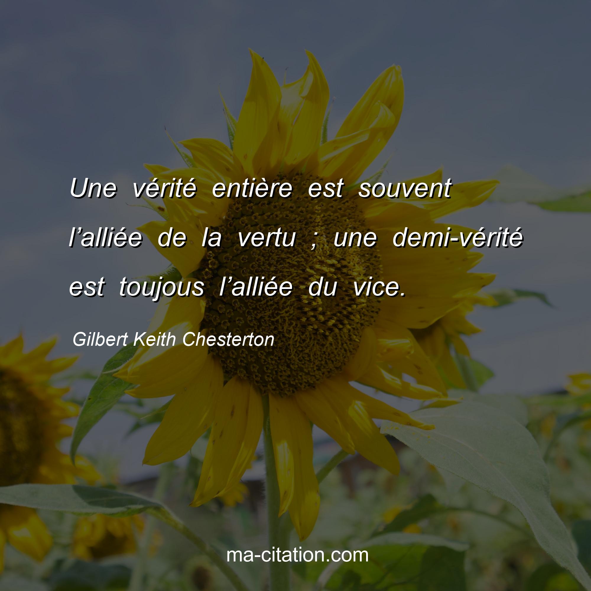 Citation sur la vie de Gilbert Keith Chesterton :Une vérité entière est souvent l’alliée de la vertu ; une demi-vérité est toujous l’alliée du vice.