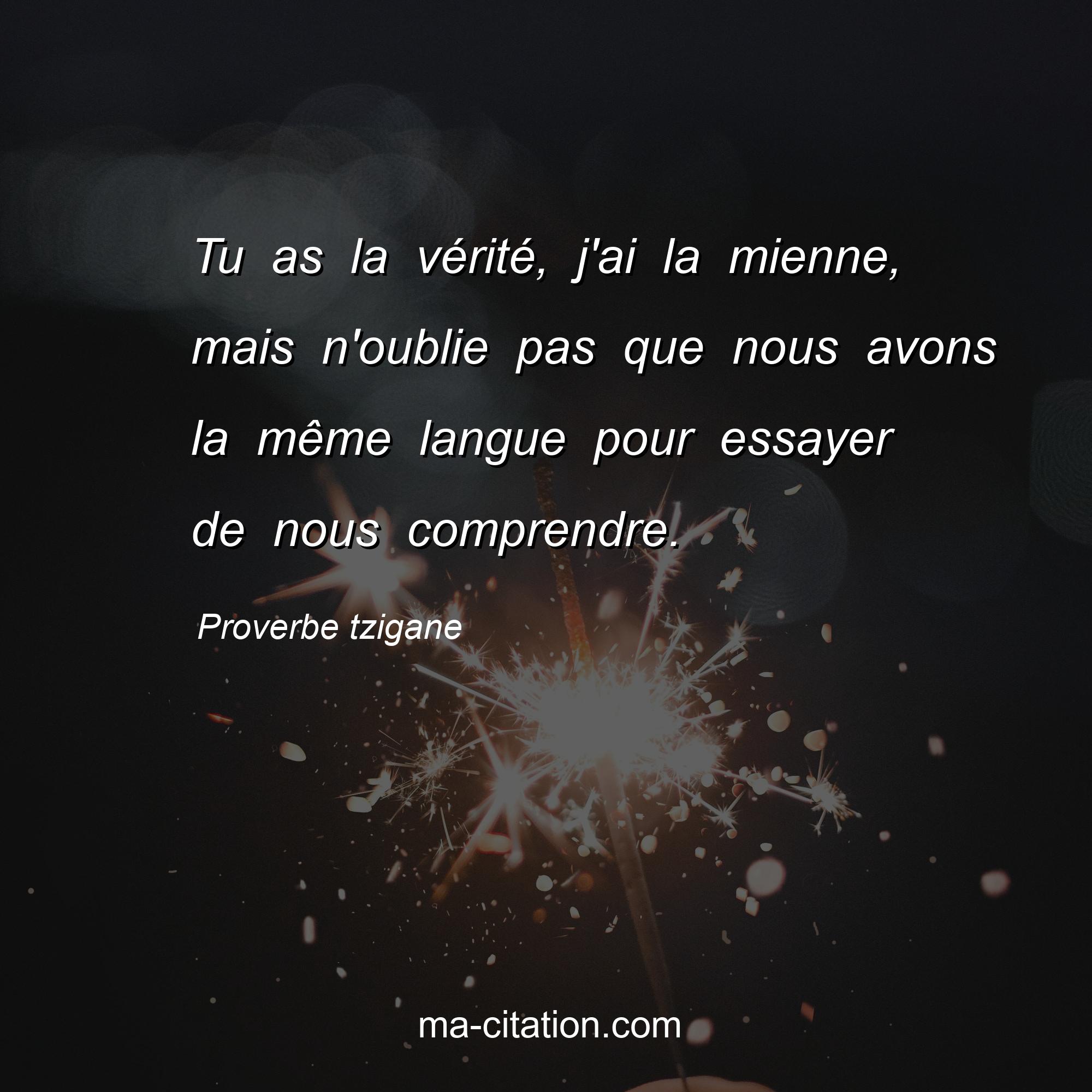 Proverbe tzigane sur la vie :Tu as la vérité, j'ai la mienne, mais n'oublie pas que nous avons la même langue pour essayer de nous comprendre.