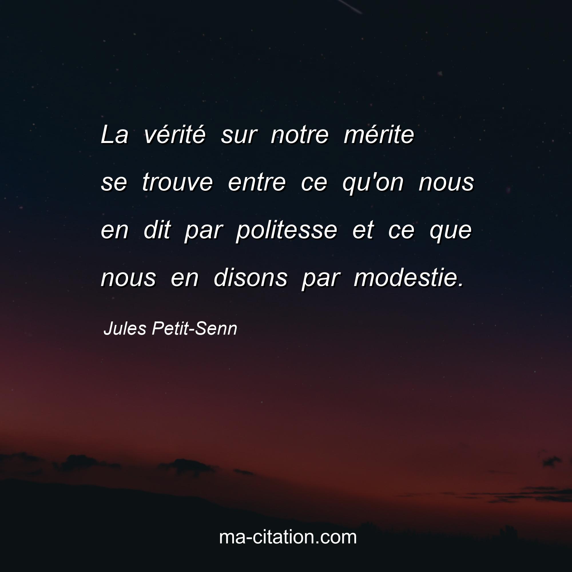 Citation sur la vie de Jules Petit-Senn :La vérité sur notre mérite se trouve entre ce qu'on nous en dit par politesse et ce que nous en disons par modestie.