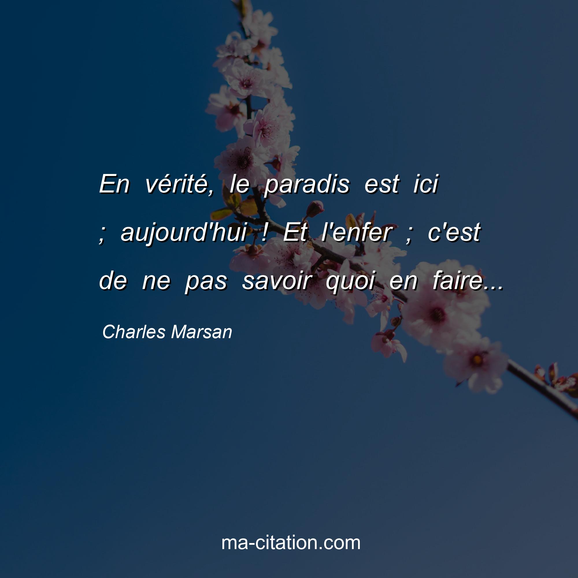 Charles Marsan est l'auteur de la citation sur la vie "En vérité, le paradis est ici ; aujourd'hui ! Et l'enfer ; c'est de ne pas savoir quoi en faire...".