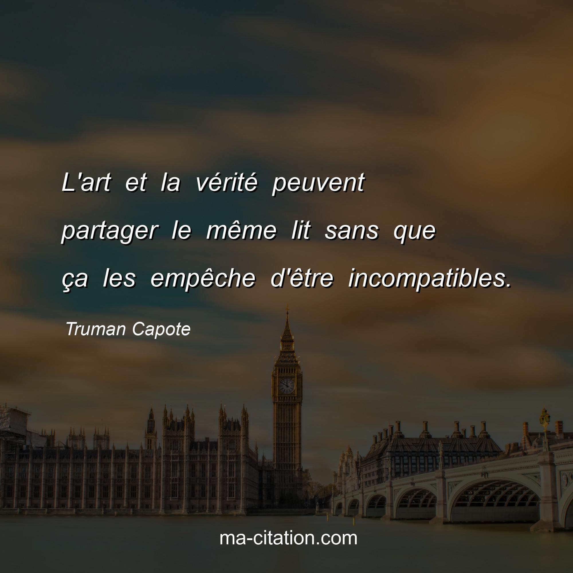 Citation sur la vie de Truman Capote :L'art et la vérité peuvent partager le même lit sans que ça les empêche d'être incompatibles.