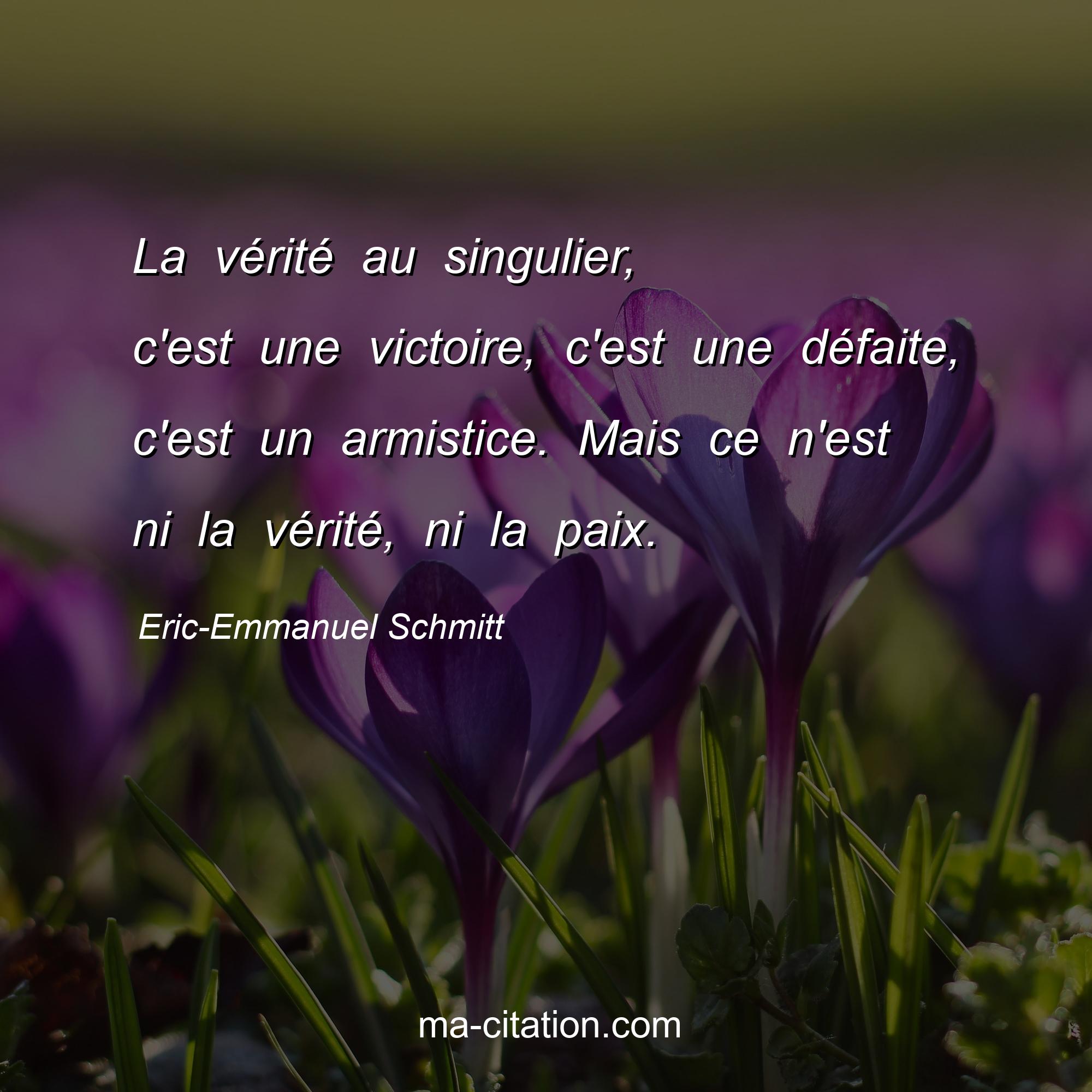 Citation sur la vie d'Eric-Emmanuel Schmitt :La vérité au singulier, c'est une victoire, c'est une défaite, c'est un armistice. Mais ce n'est ni la vérité, ni la paix.