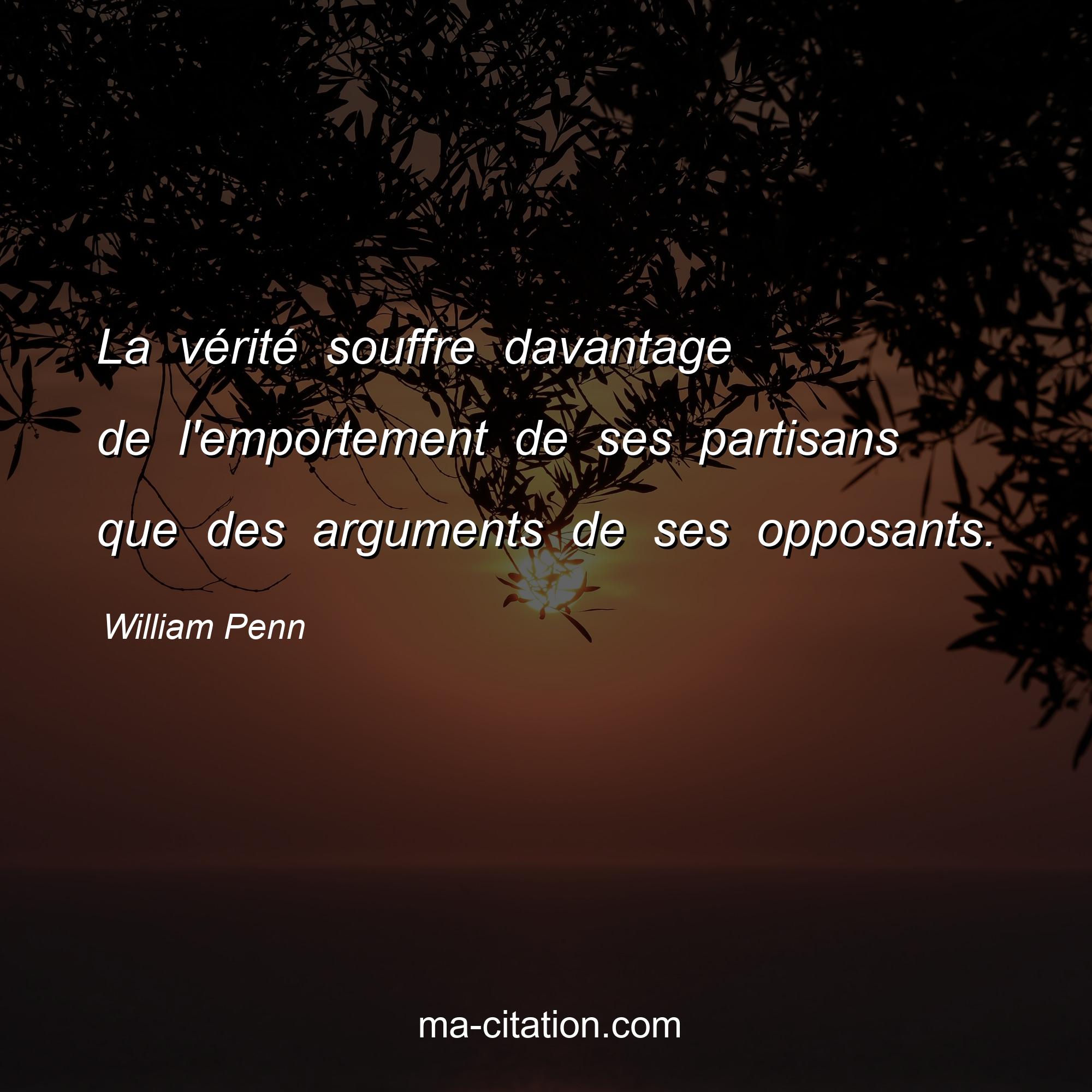 Citation sur la vie de William Penn :La vérité souffre davantage de l'emportement de ses partisans que des arguments de ses opposants.