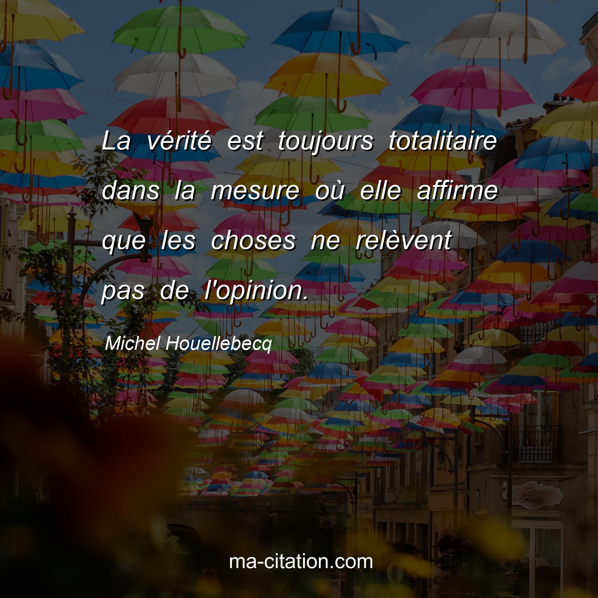 Citation sur la vie de Michel Houellebecq :La vérité est toujours totalitaire dans la mesure où elle affirme que les choses ne relèvent pas de l'opinion.