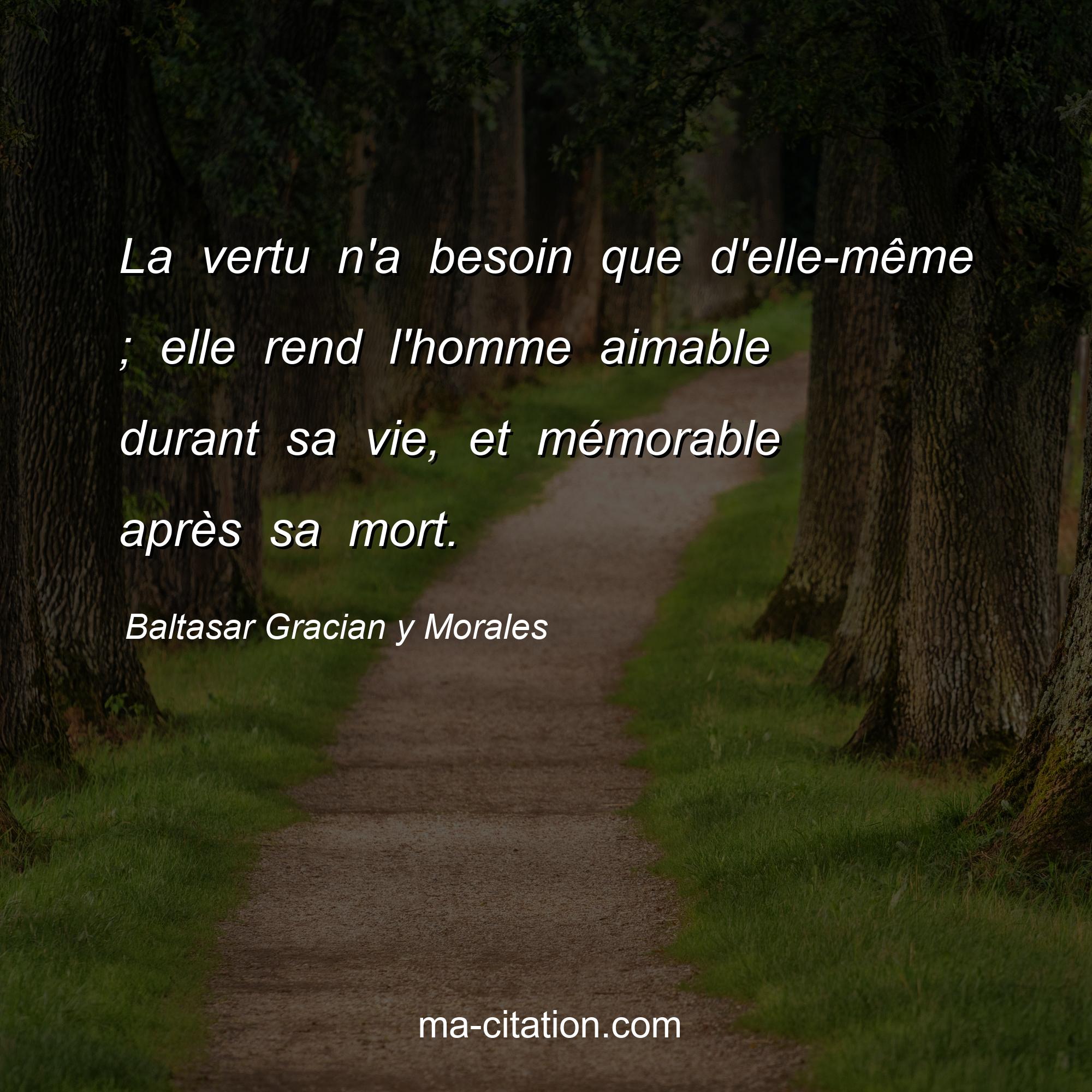 Citation sur la vie de Baltasar Gracian y Morales :La vertu n'a besoin que d'elle-même ; elle rend l'homme aimable durant sa vie, et mémorable après sa mort.