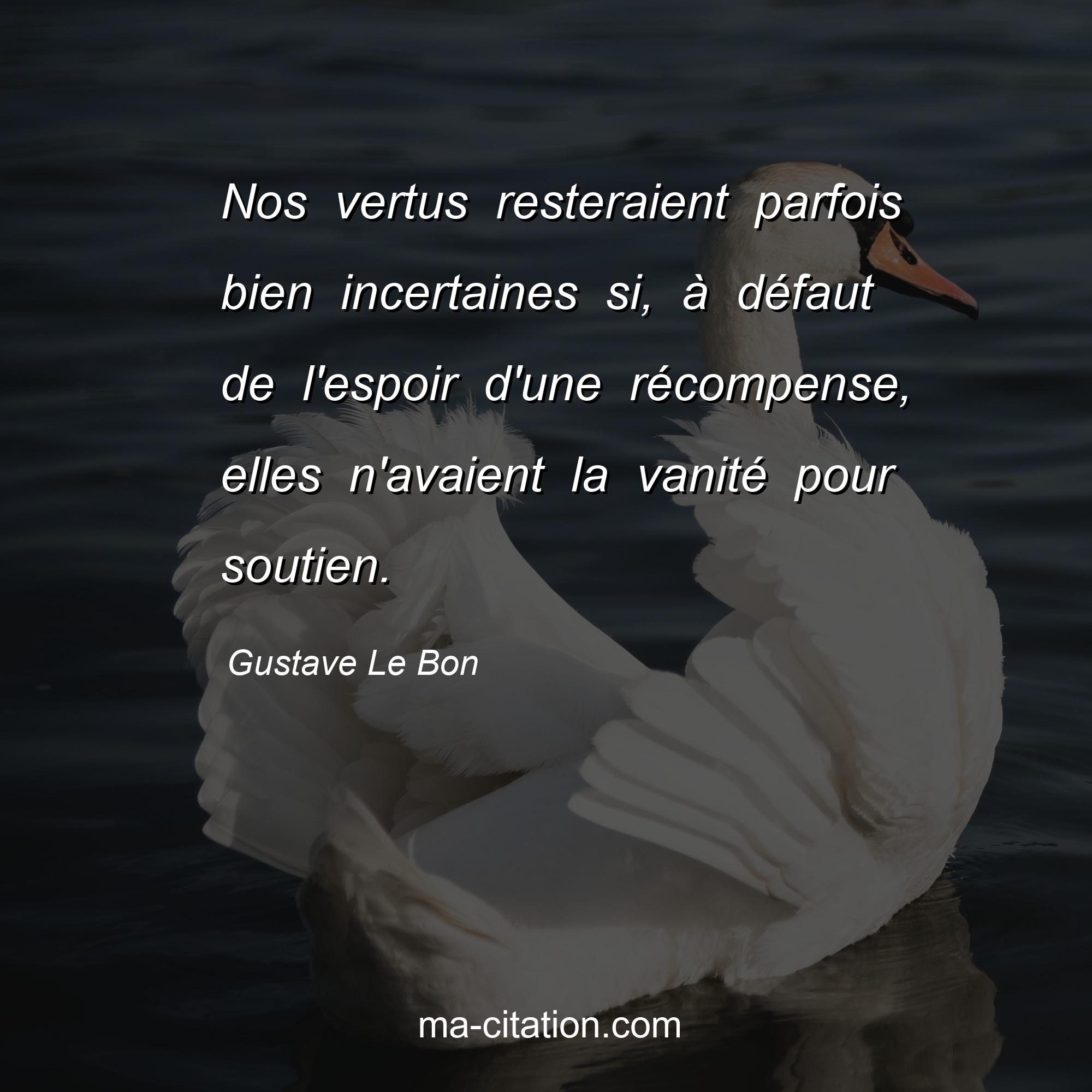 Citation sur la vie de Gustave Le Bon :Nos vertus resteraient parfois bien incertaines si, à défaut de l'espoir d'une récompense, elles n'avaient la vanité pour soutien.