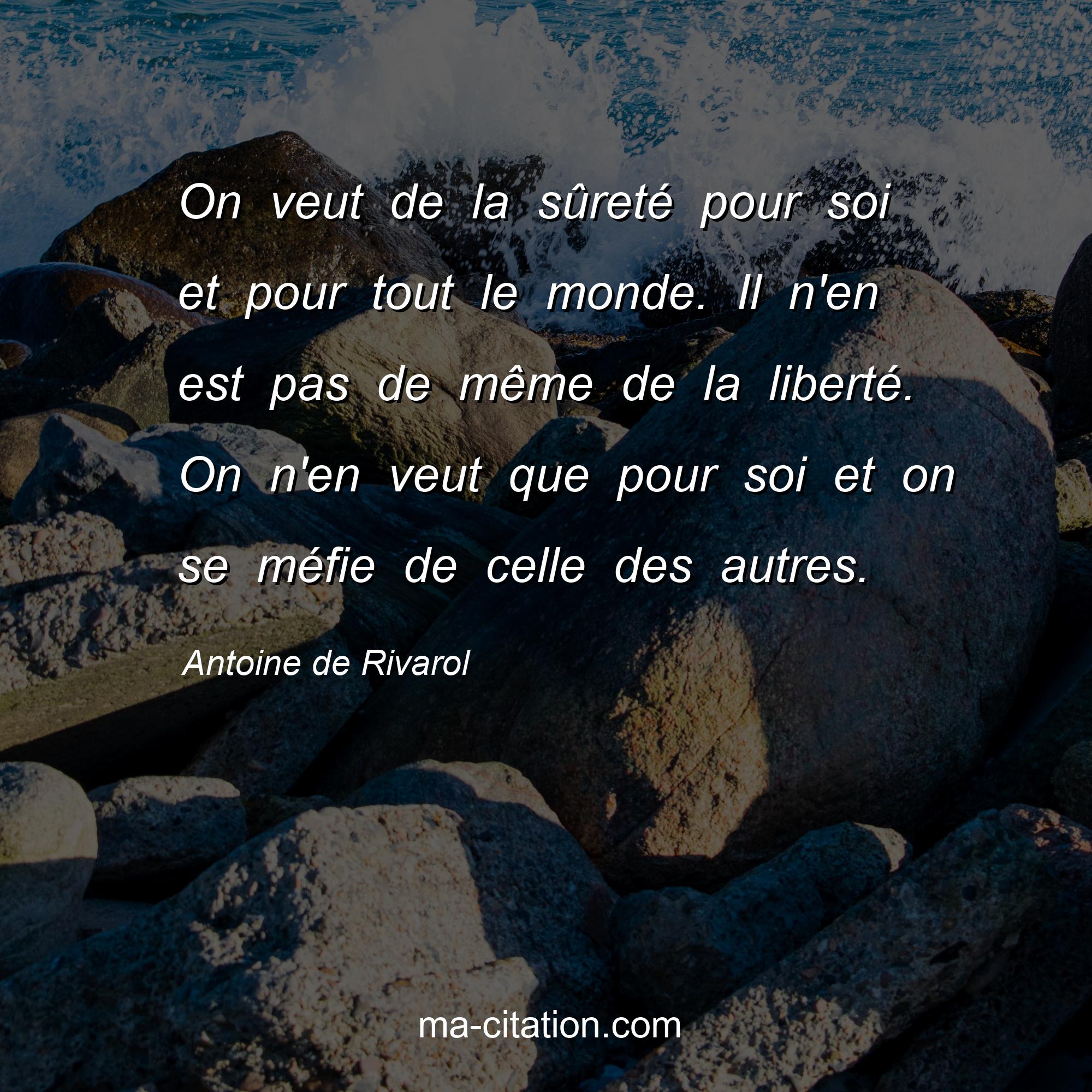 Citation sur la vie d'Antoine de Rivarol :On veut de la sûreté pour soi et pour tout le monde. Il n'en est pas de même de la liberté. On n'en veut que pour soi et on se méfie de celle des autres.