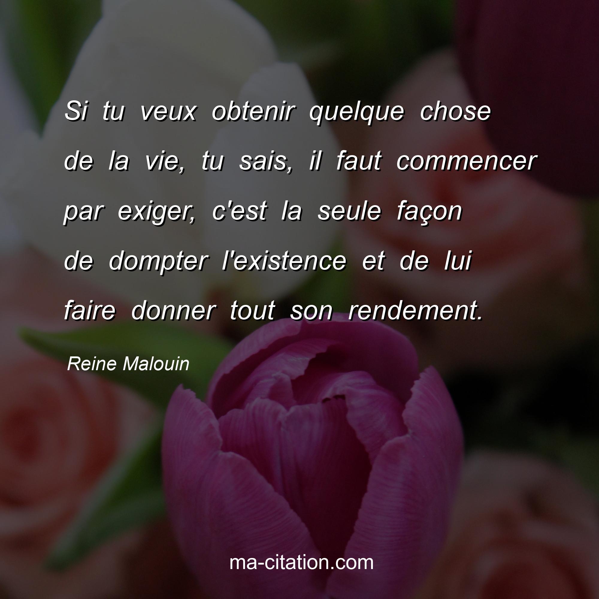 Citation sur la vie de Reine Malouin :Si tu veux obtenir quelque chose de la vie, tu sais, il faut commencer par exiger, c'est la seule façon de dompter l'existence et de lui faire donner tout son rendement.