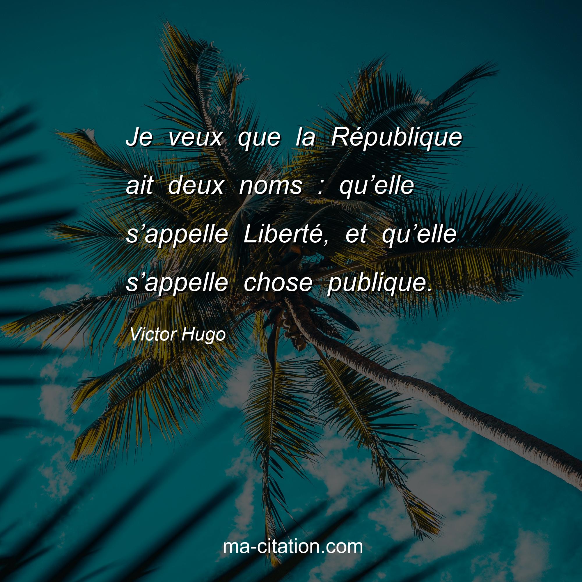 Citation sur la vie de Victor Hugo :Je veux que la République ait deux noms : qu’elle s’appelle Liberté, et qu’elle s’appelle chose publique.
