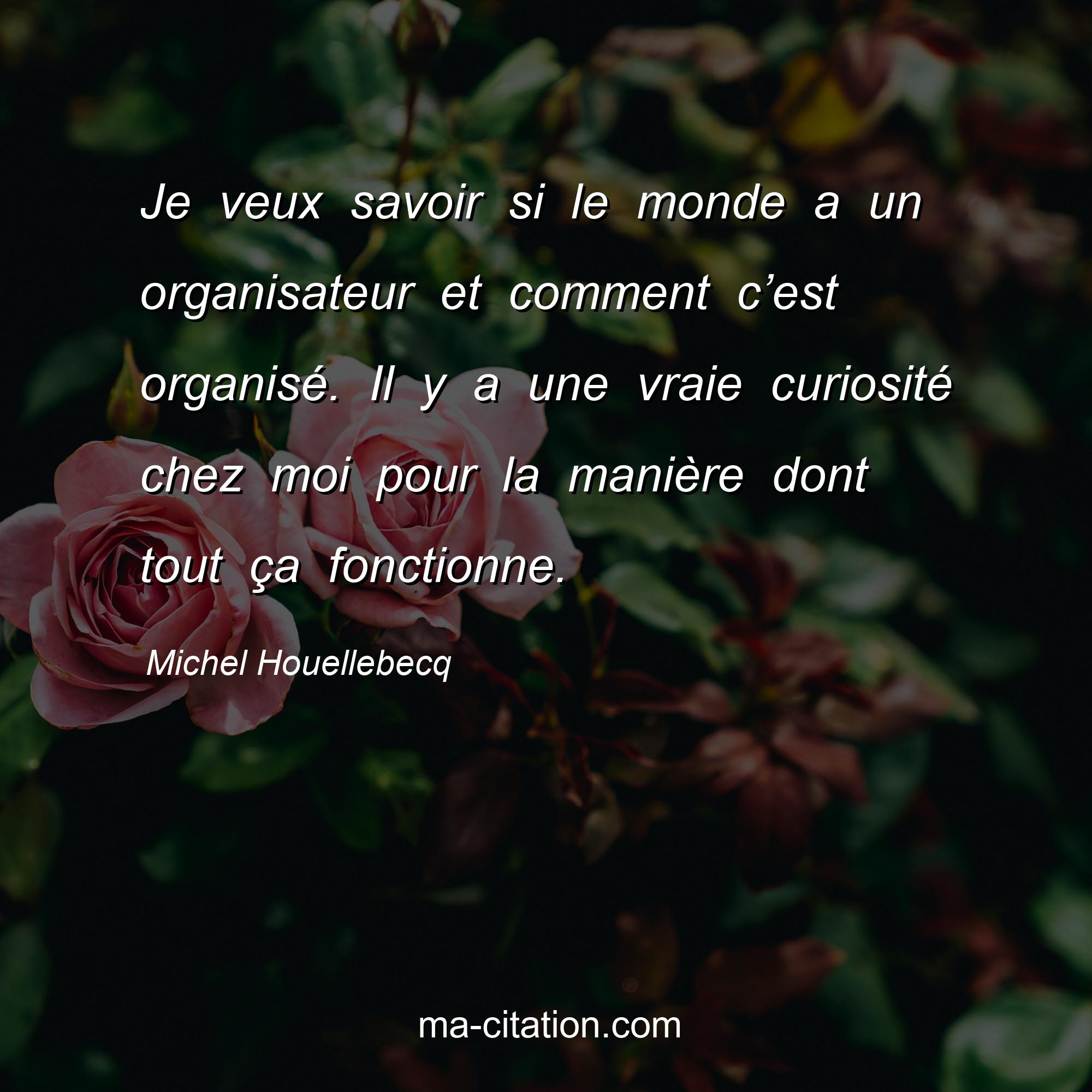 Citation sur la vie de Michel Houellebecq :Je veux savoir si le monde a un organisateur et comment c’est organisé. Il y a une vraie curiosité chez moi pour la manière dont tout ça fonctionne.