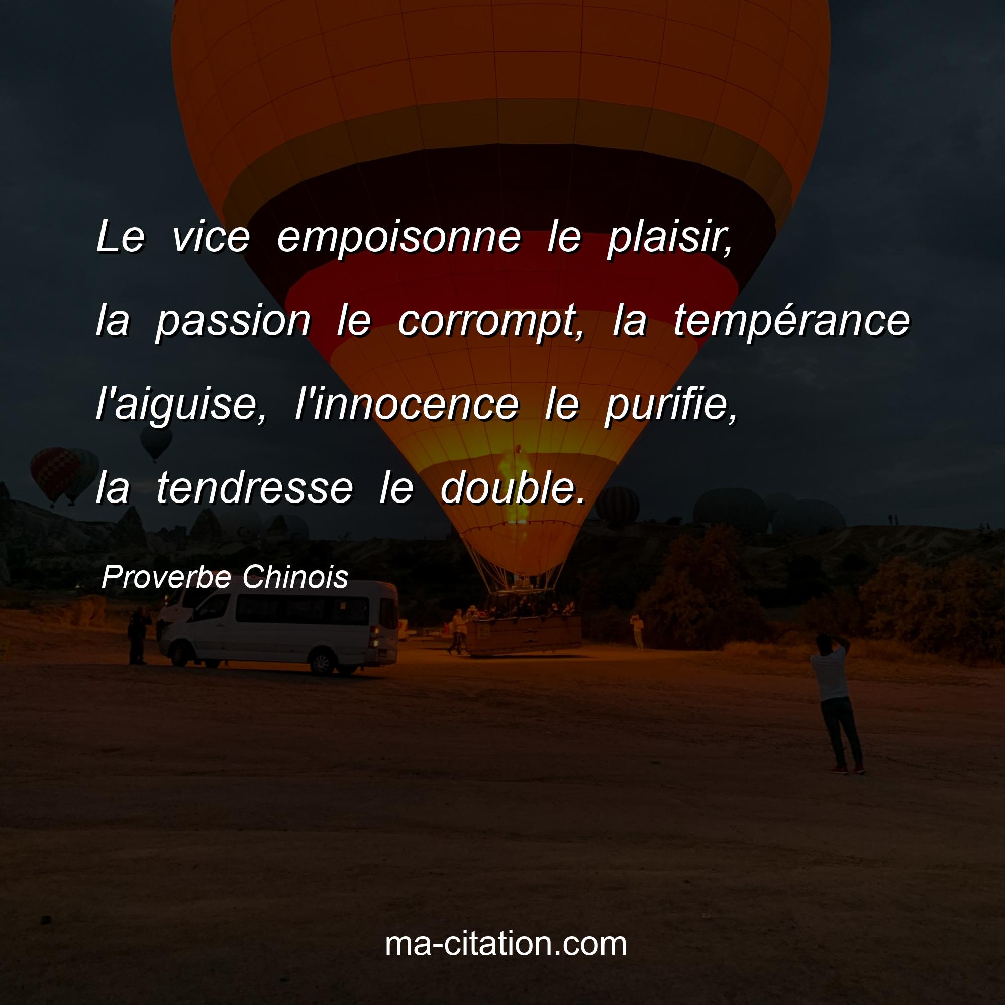 Proverbe Chinois sur la vie :Le vice empoisonne le plaisir, la passion le corrompt, la tempérance l'aiguise, l'innocence le purifie, la tendresse le double.