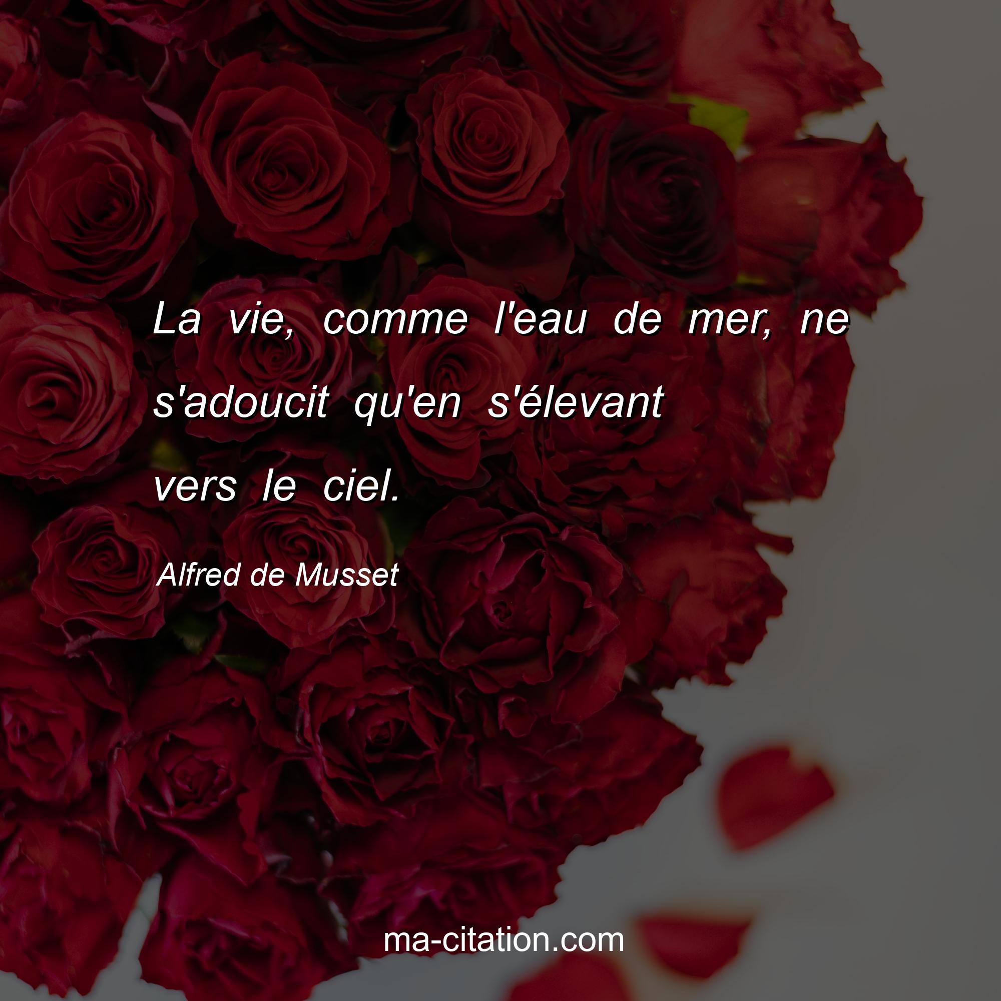 Citation sur la vie d'Alfred de Musset :La vie, comme l'eau de mer, ne s'adoucit qu'en s'élevant vers le ciel.