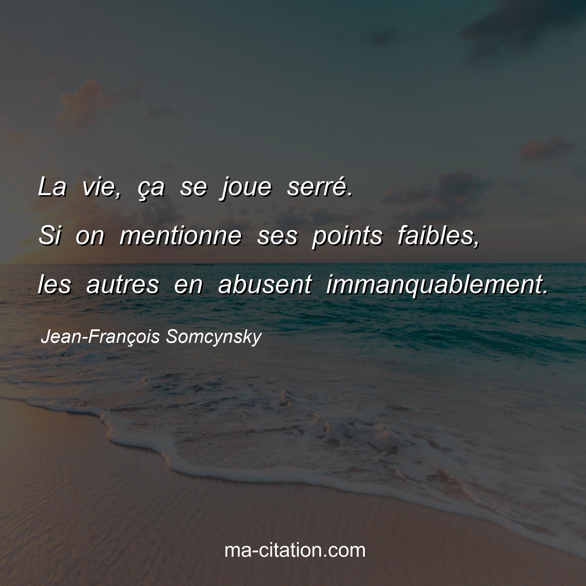 Citation sur la vie de Jean-François Somcynsky :La vie, ça se joue serré. Si on mentionne ses points faibles, les autres en abusent immanquablement.