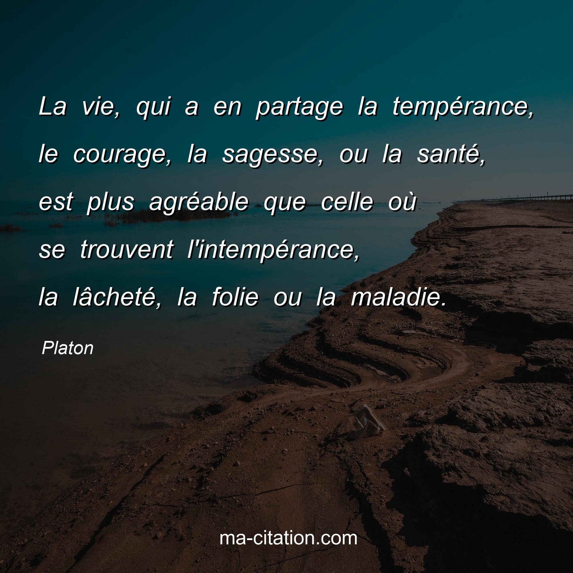 Platon est l'auteur de la citation sur la vie "La vie, qui a en partage la tempérance, le courage, la sagesse, ou la santé, est plus agréable que celle où se trouvent l'intempérance, la lâcheté, la folie ou la maladie.".