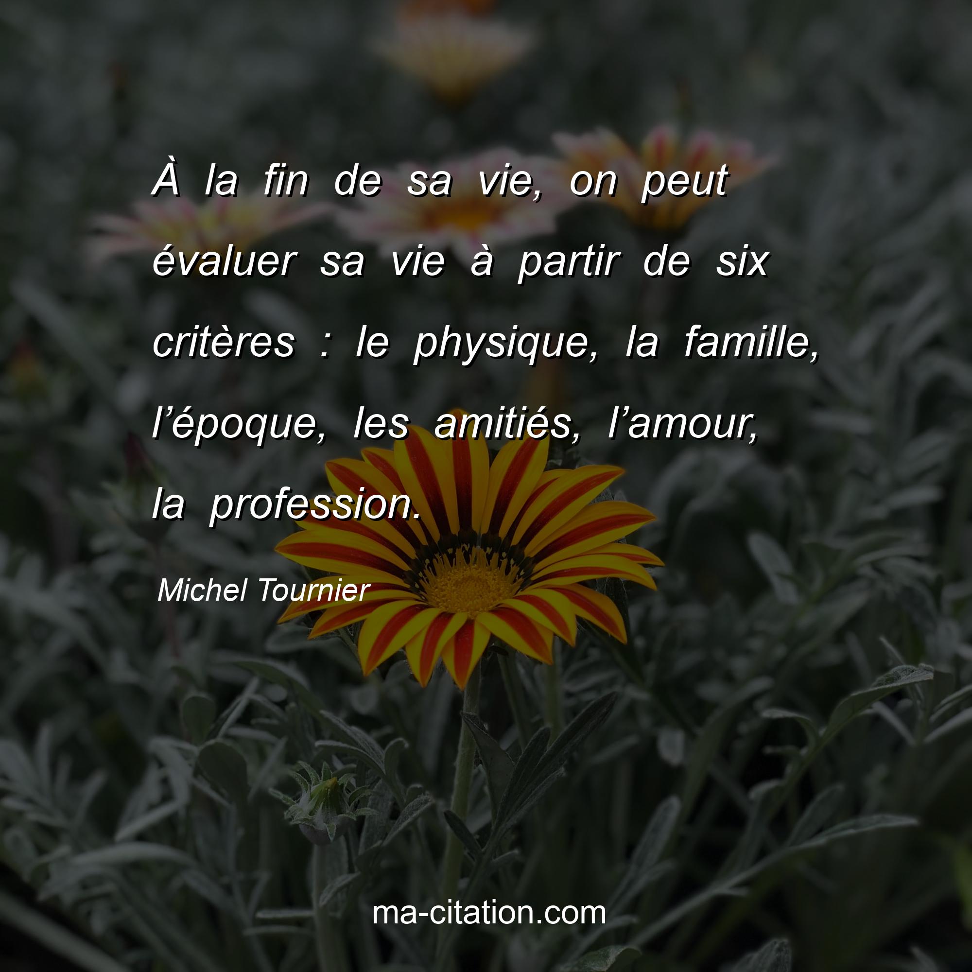 Michel Tournier est l'auteur de la citation sur la vie "À la fin de sa vie, on peut évaluer sa vie à partir de six critères : le physique, la famille, l’époque, les amitiés, l’amour, la profession.".