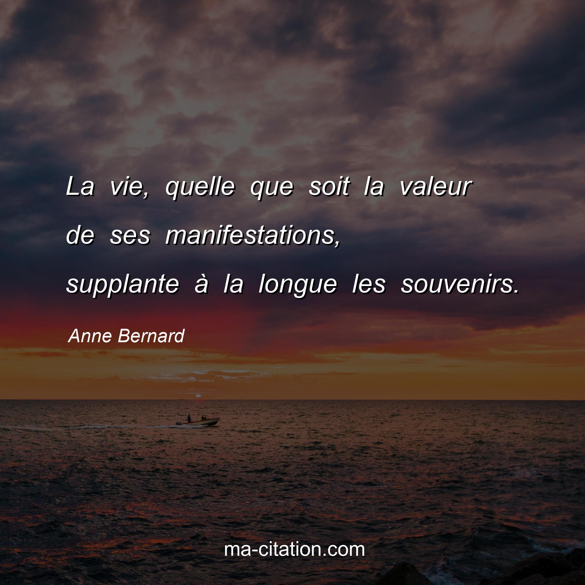 Anne Bernard est l'auteur de la citation sur la vie "La vie, quelle que soit la valeur de ses manifestations, supplante à la longue les souvenirs.".