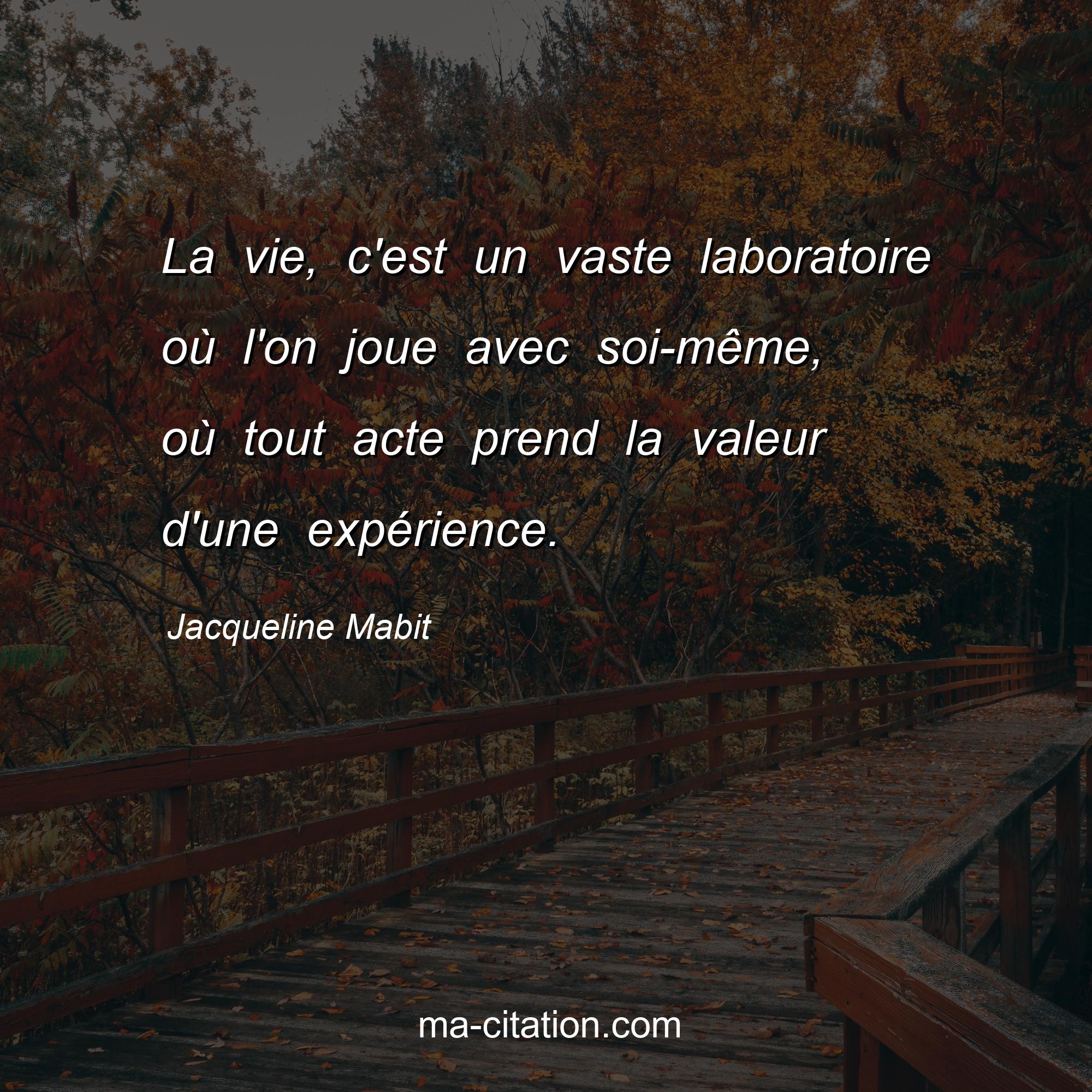 Jacqueline Mabit est l'auteur de la citation sur la vie "La vie, c'est un vaste laboratoire où l'on joue avec soi-même, où tout acte prend la valeur d'une expérience.".
