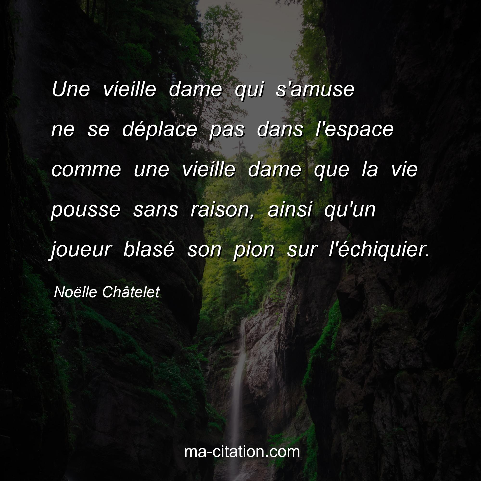 Citation sur la vie de Noëlle Châtelet :Une vieille dame qui s'amuse ne se déplace pas dans l'espace comme une vieille dame que la vie pousse sans raison, ainsi qu'un joueur blasé son pion sur l'échiquier.